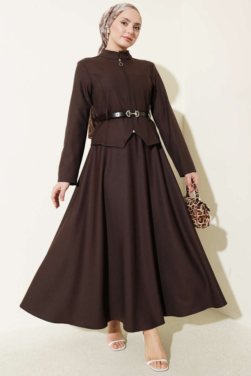 Basic Skirt 2 Piece Set with Belt and Zipper has an elegant design suitable for both formal and casual wear with its modern and structured look. The stand-up collar and full-length zipper detail on the top offer practical use, while the stylish belt accessory at the waist elegantly accentuates the silhouette. The wide, flowing skirt structure adds freedom of movement and comfortable elegance to the outfit.
