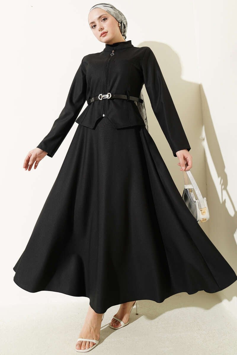 Basic Skirt 2 Piece Set with Belt and Zipper has an elegant design suitable for both formal and casual wear with its modern and structured look. The stand-up collar and full-length zipper detail on the top offer practical use, while the stylish belt accessory at the waist elegantly accentuates the silhouette. The wide, flowing skirt structure adds freedom of movement and comfortable elegance to the outfit.