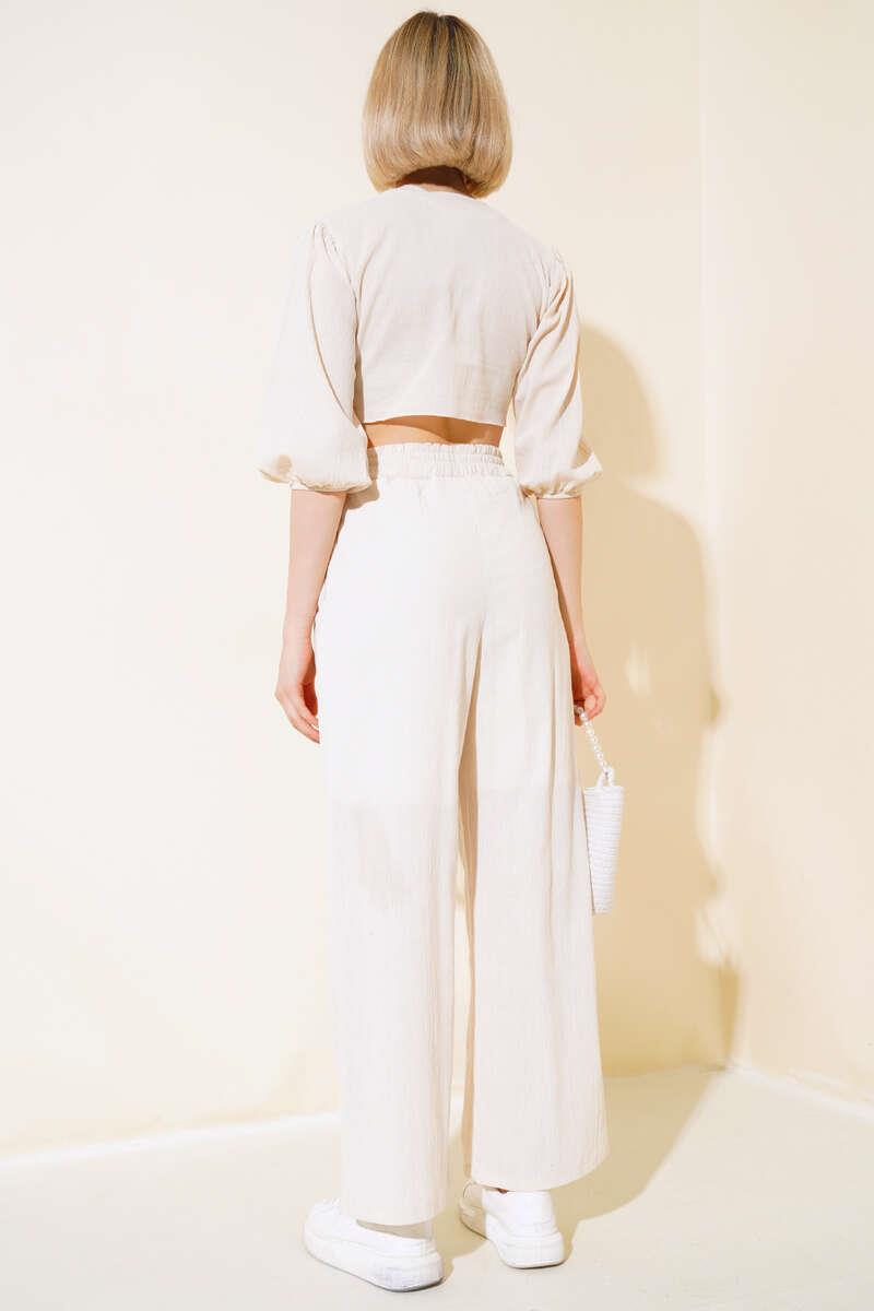 Our new season 2 Piece Set model is with you. Our crop top has a V-neck collar. It buttons down the front. It has a self-tying detail in the front. The sleeves are loose-fitting and elastic. The waist of our trousers is elastic. The legs are wide and have pockets. You will like our suit with its look and comfort.