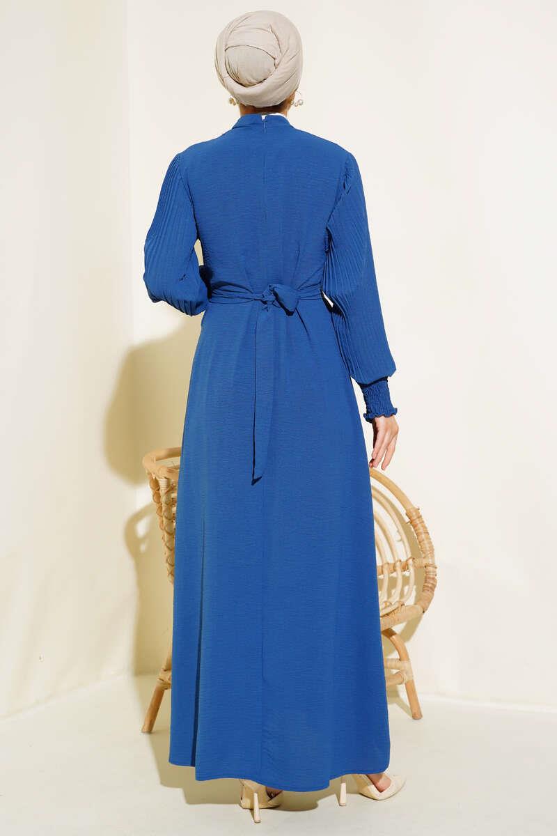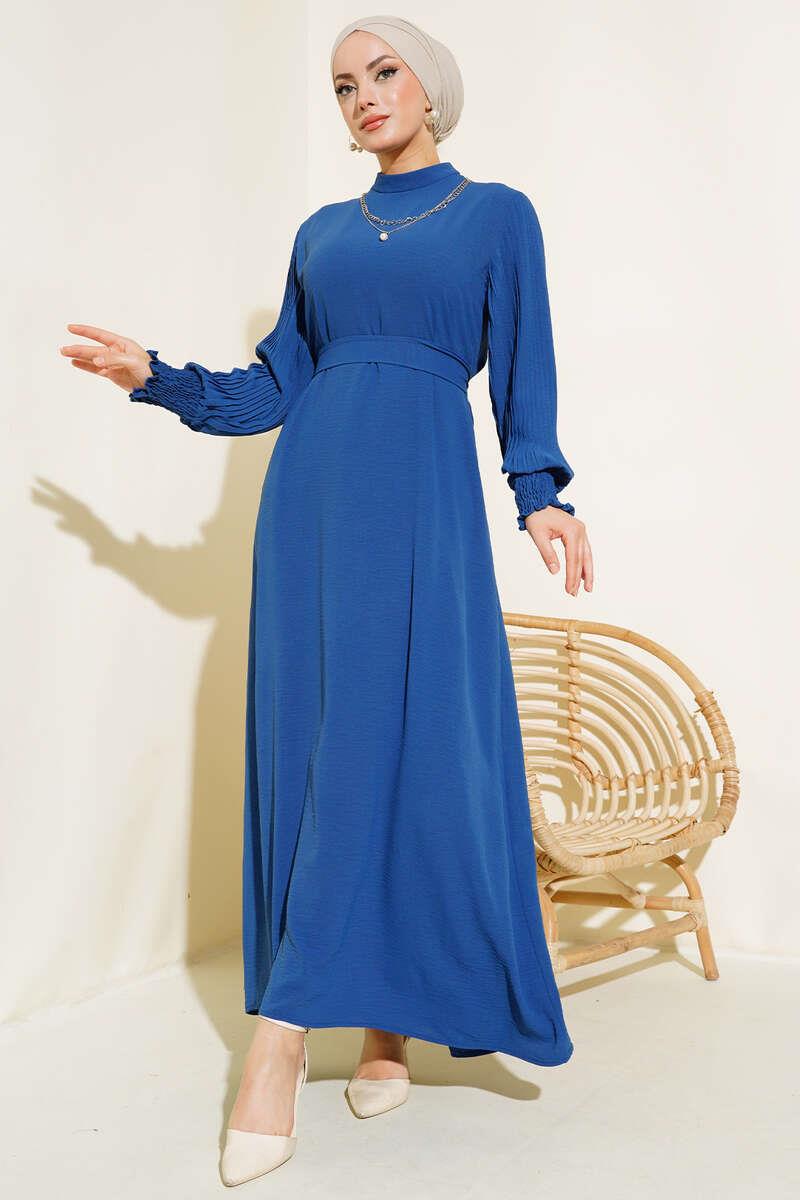Our new season dress is with you. The wrists of our dress are gathered. The sleeves are pleated. There are two belt loops and a belt made of its own fabric at the waist. Our dress is available in different color options.