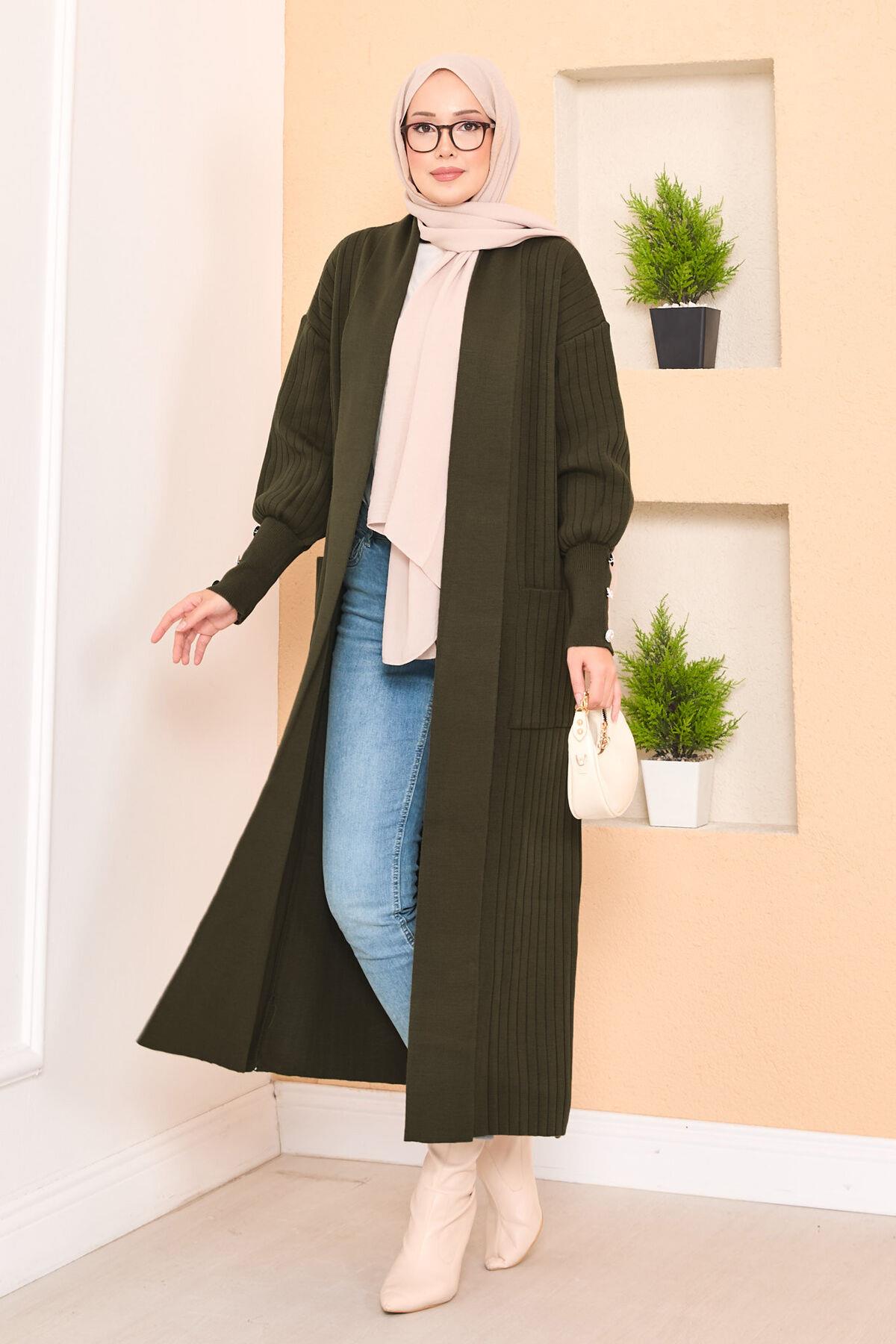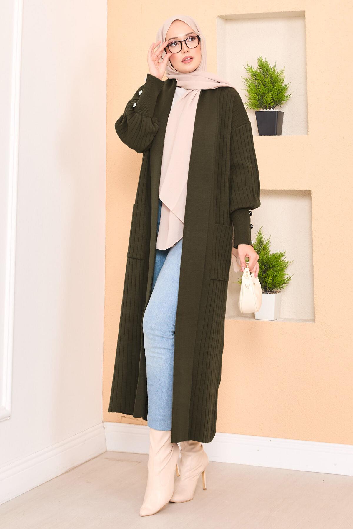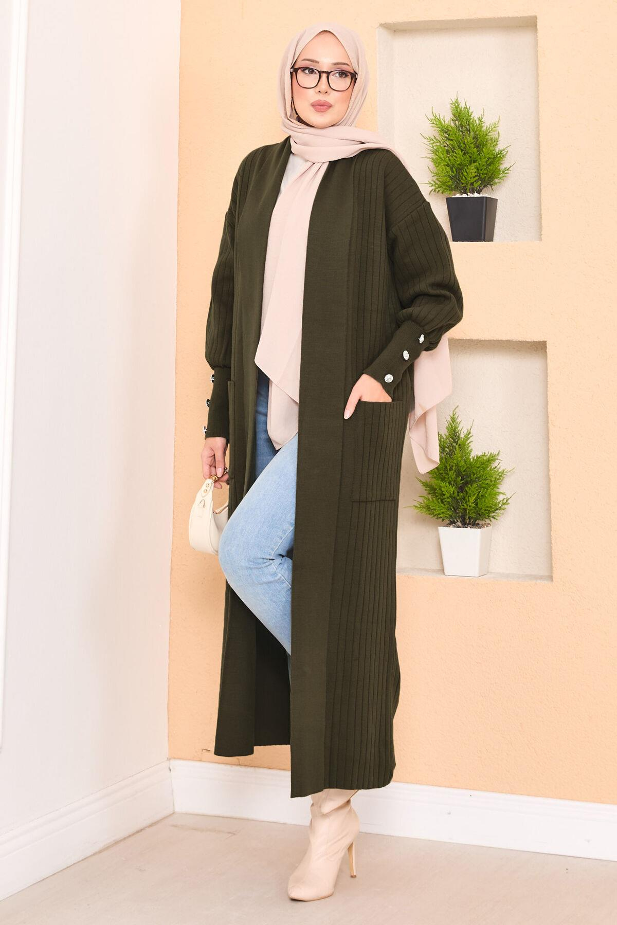 Shawl Collar Hijab Knitwear Cardigan Khaki with Buttoned Sleeves (125M00917146R22STD)