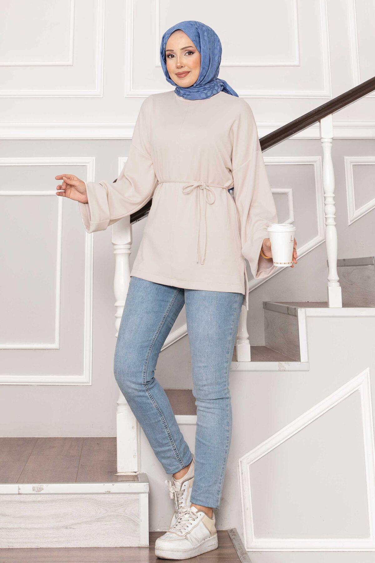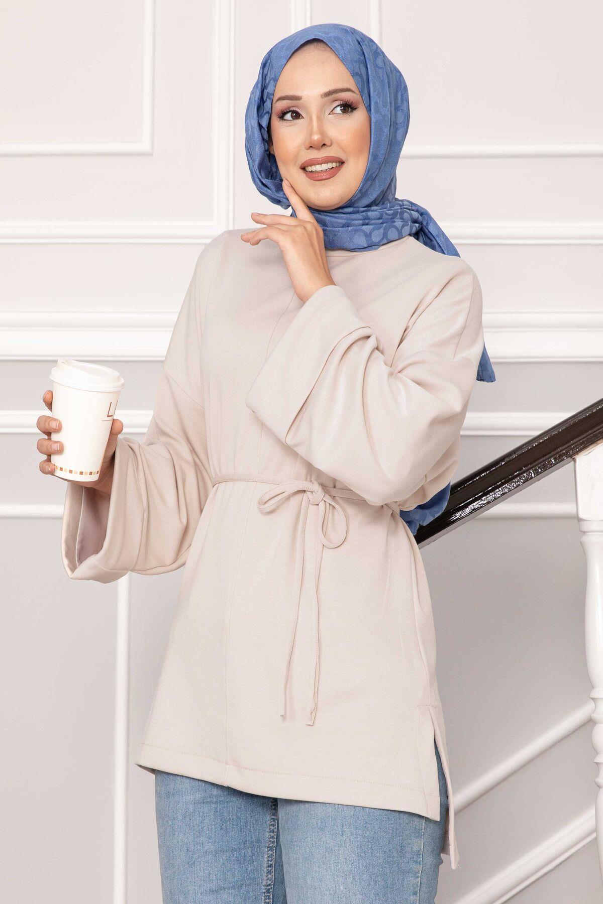Loysha Tunic with Folded Sleeves and Belt, Cream (125M00321148R3238)