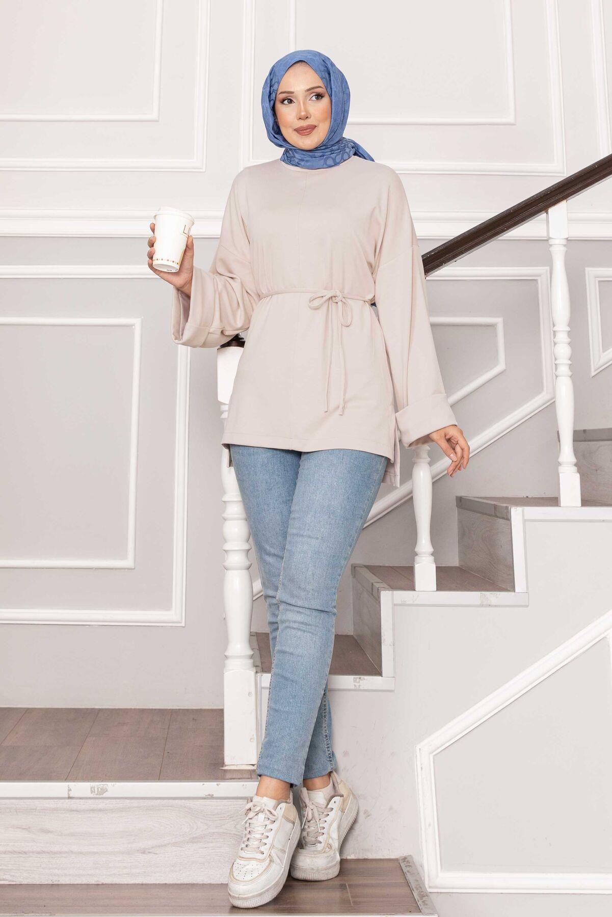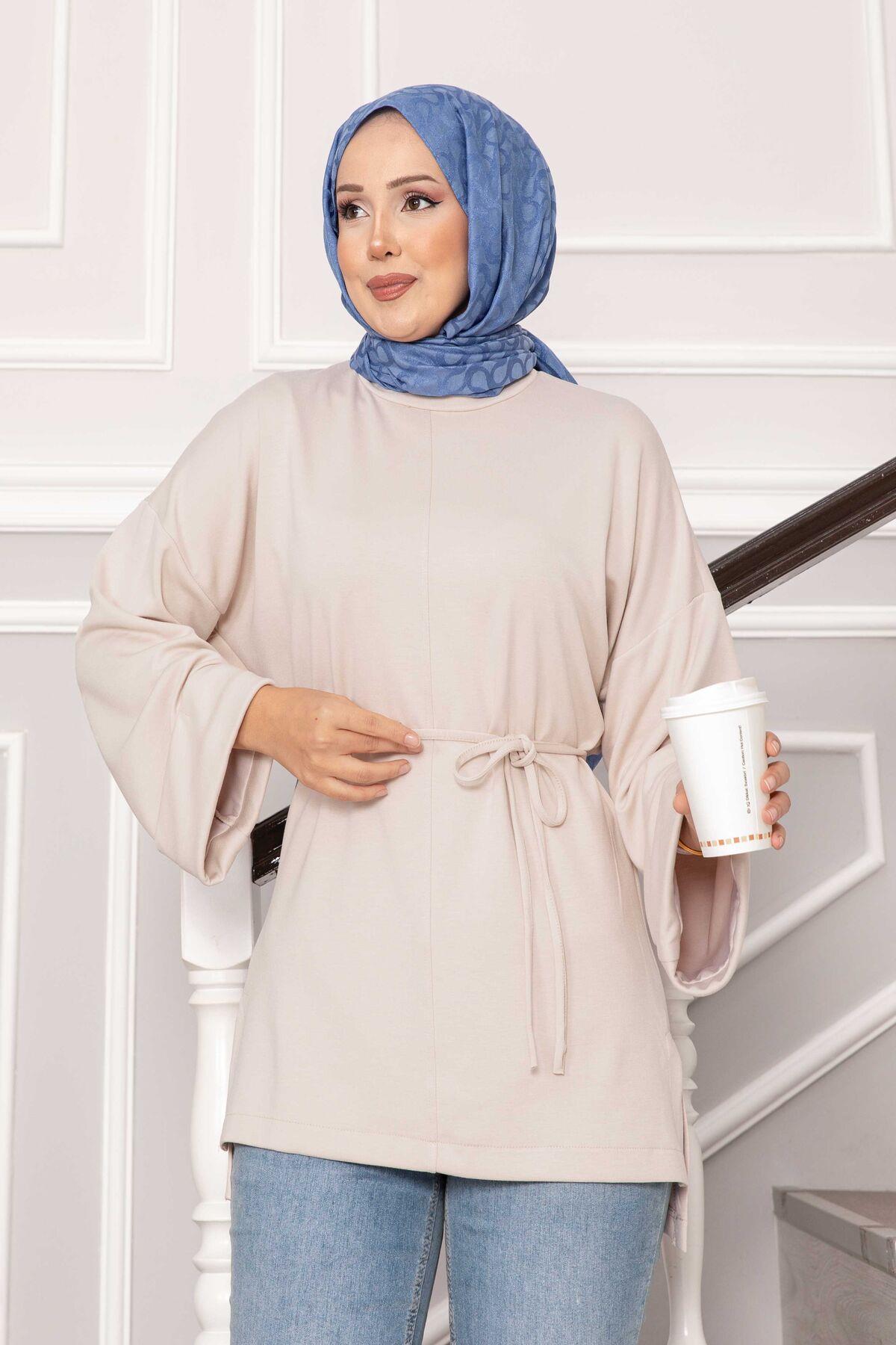 • The product is seasonal. The new season has foldable sleeves and a removable belt. Our tunic is short in the front and long in the back.