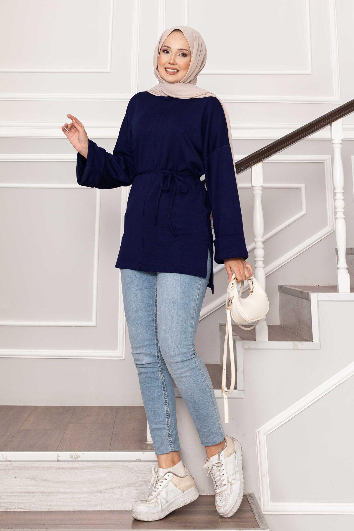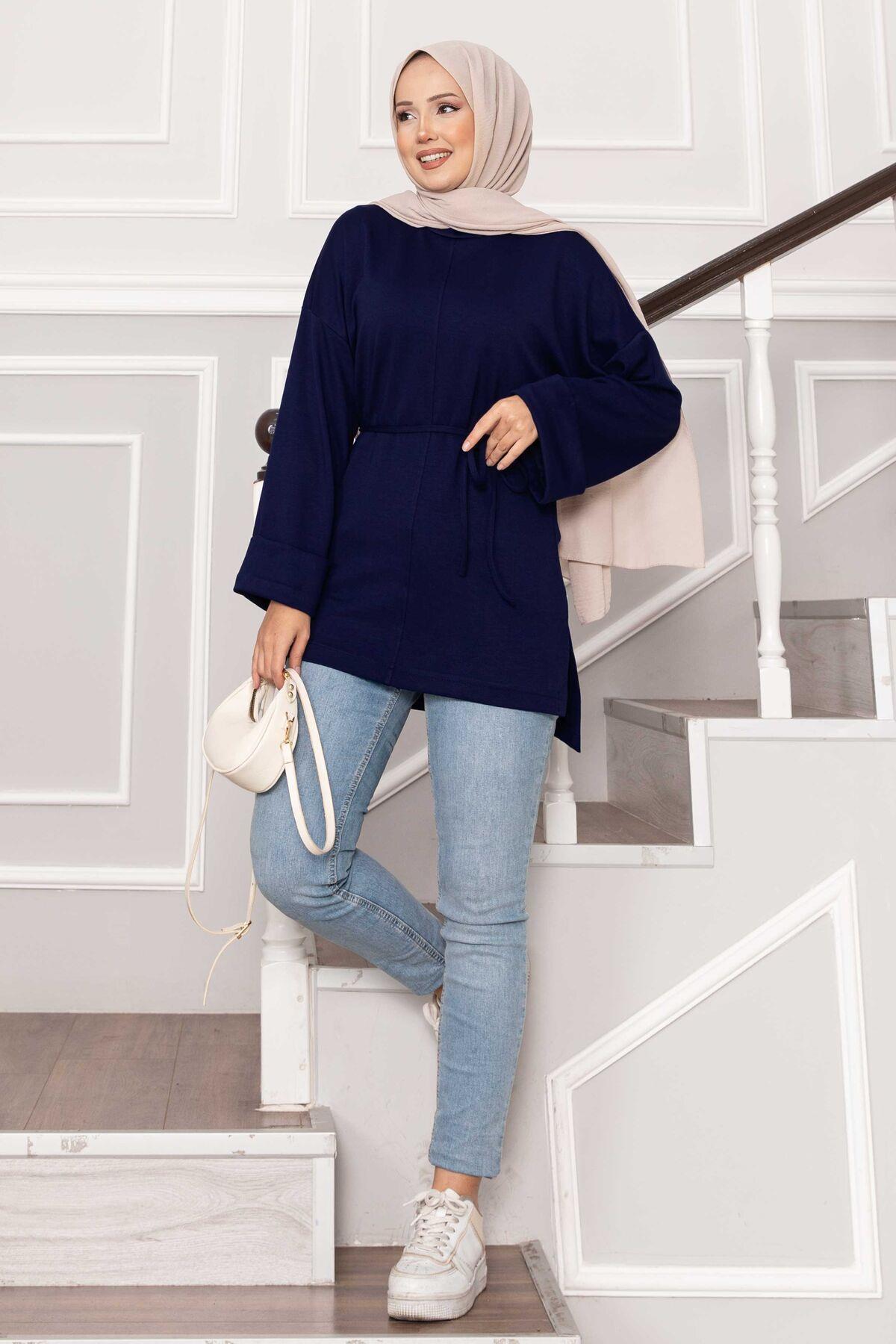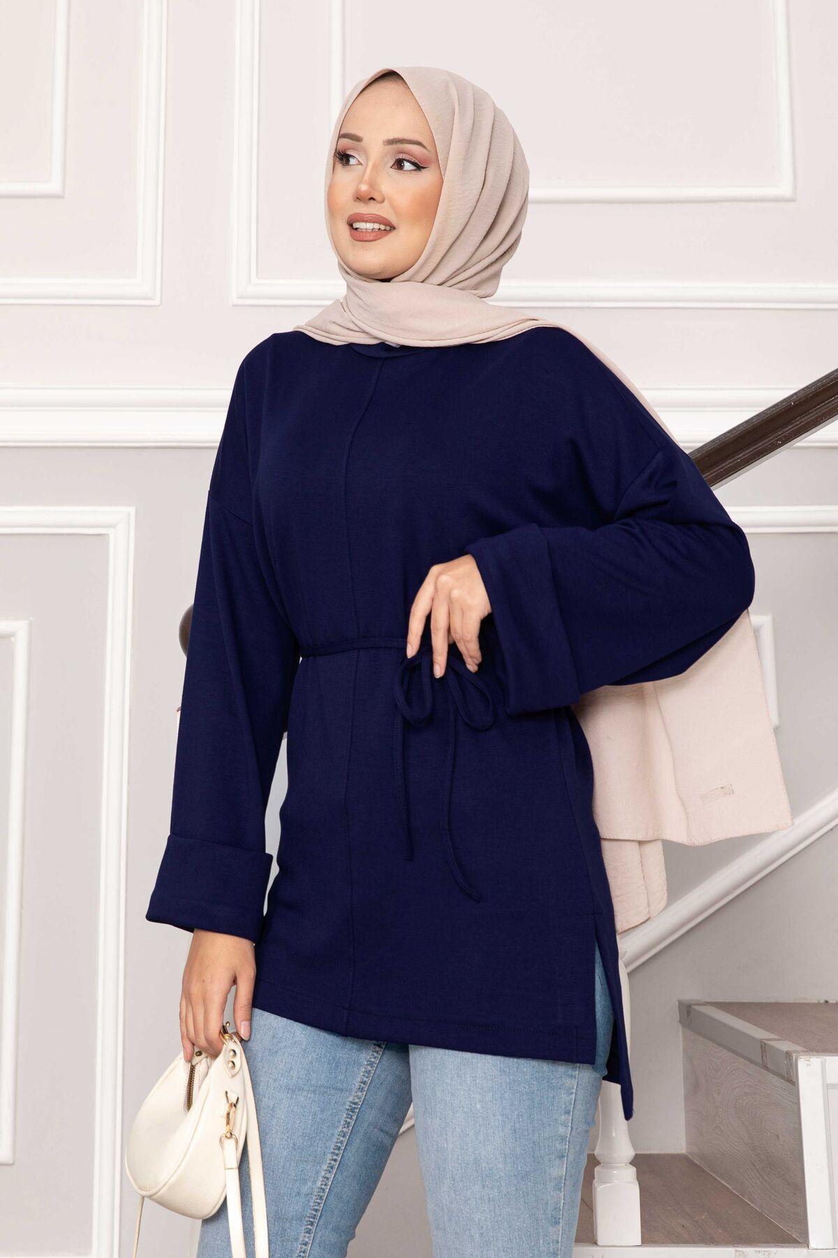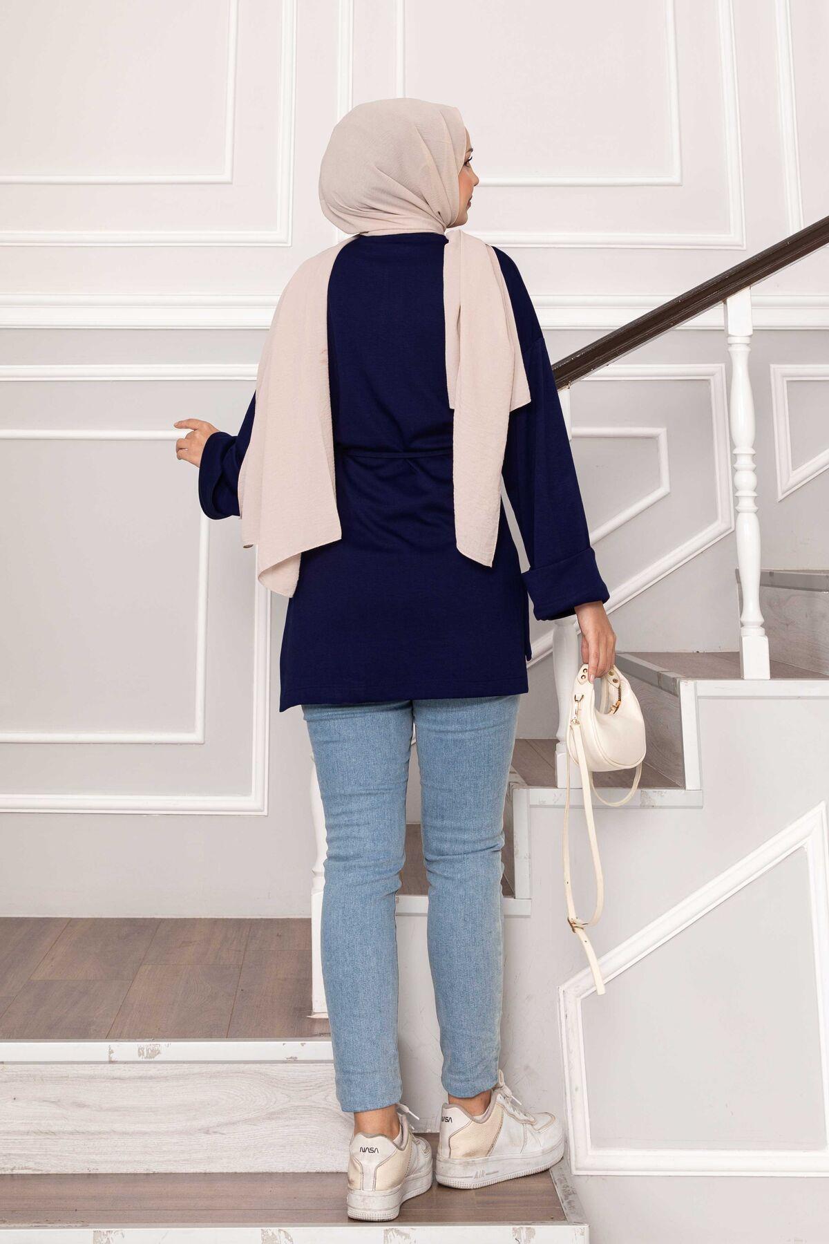Loysha Tunic with Folded Sleeves and Belt, Navy Blue (125M00321148R3338)