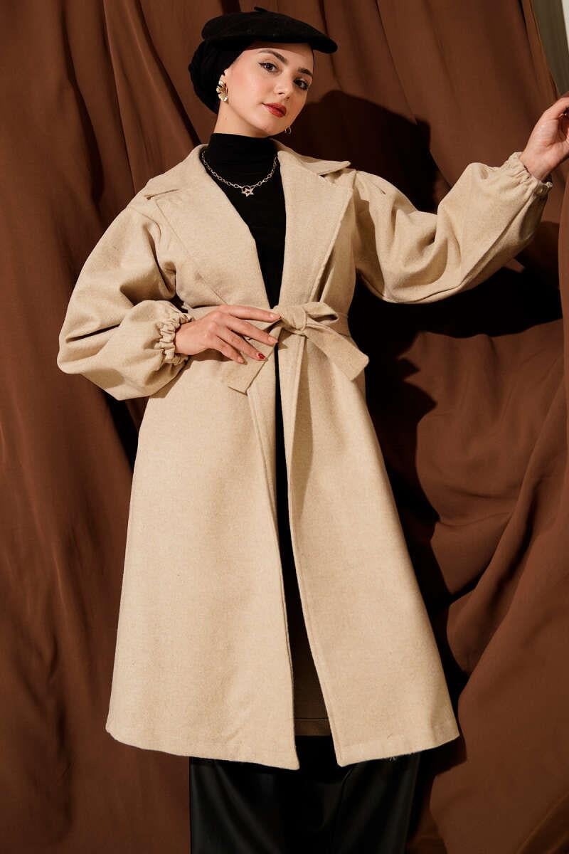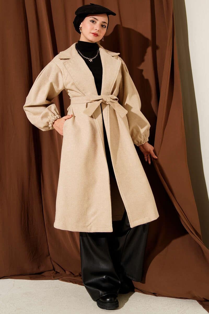 Double Breasted Balloon Sleeve Belted Coat Beige (8209-6521-680521)