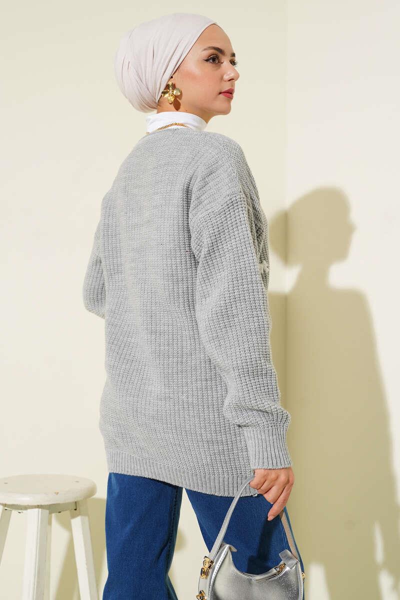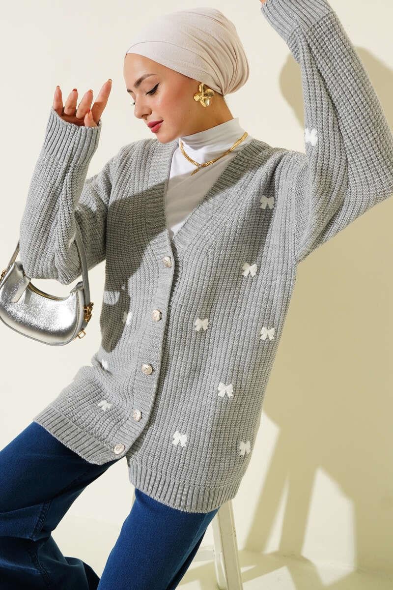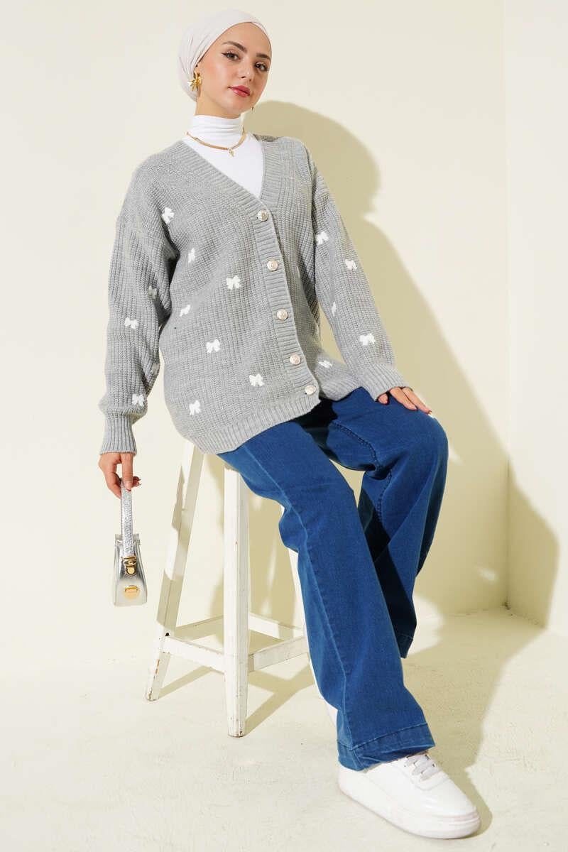 Ribbon-Decorated Knitted Cardigan Gray (6999-490-681862)