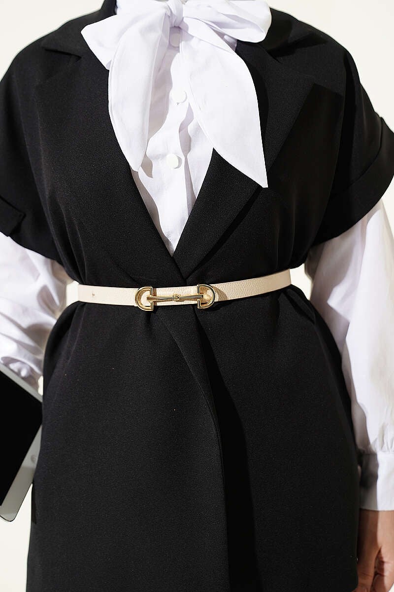 This vest, showcasing a modern look with its classic blazer collar, offers the opportunity to elegantly accentuate your silhouette thanks to the belt detail at the waist. With its dropped shoulder cut and comfortable fit, it combines masculine lines with a feminine touch, becoming the most stylish complement to layered outfits. With its functional side pockets and high-quality fabric texture, it promises comfortable use in both office elegance and everyday style. This design, which pairs perfectly with shirts and blouses, is an ideal outerwear alternative that will add a sophisticated touch to your wardrobe. Model Information: Height: 167 cm, Chest: 87 cm, Waist: 67 cm, Hips: 91 cm. The product on the model is size 36.