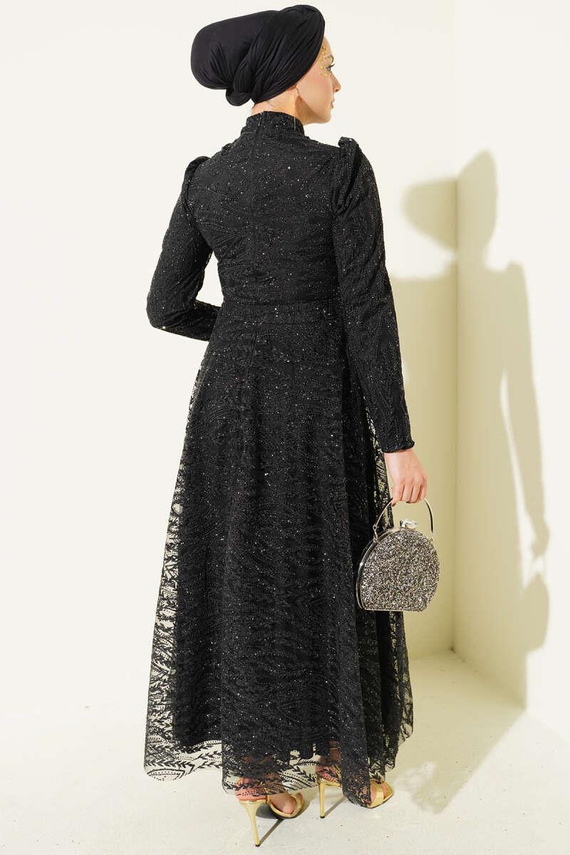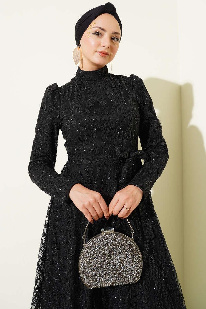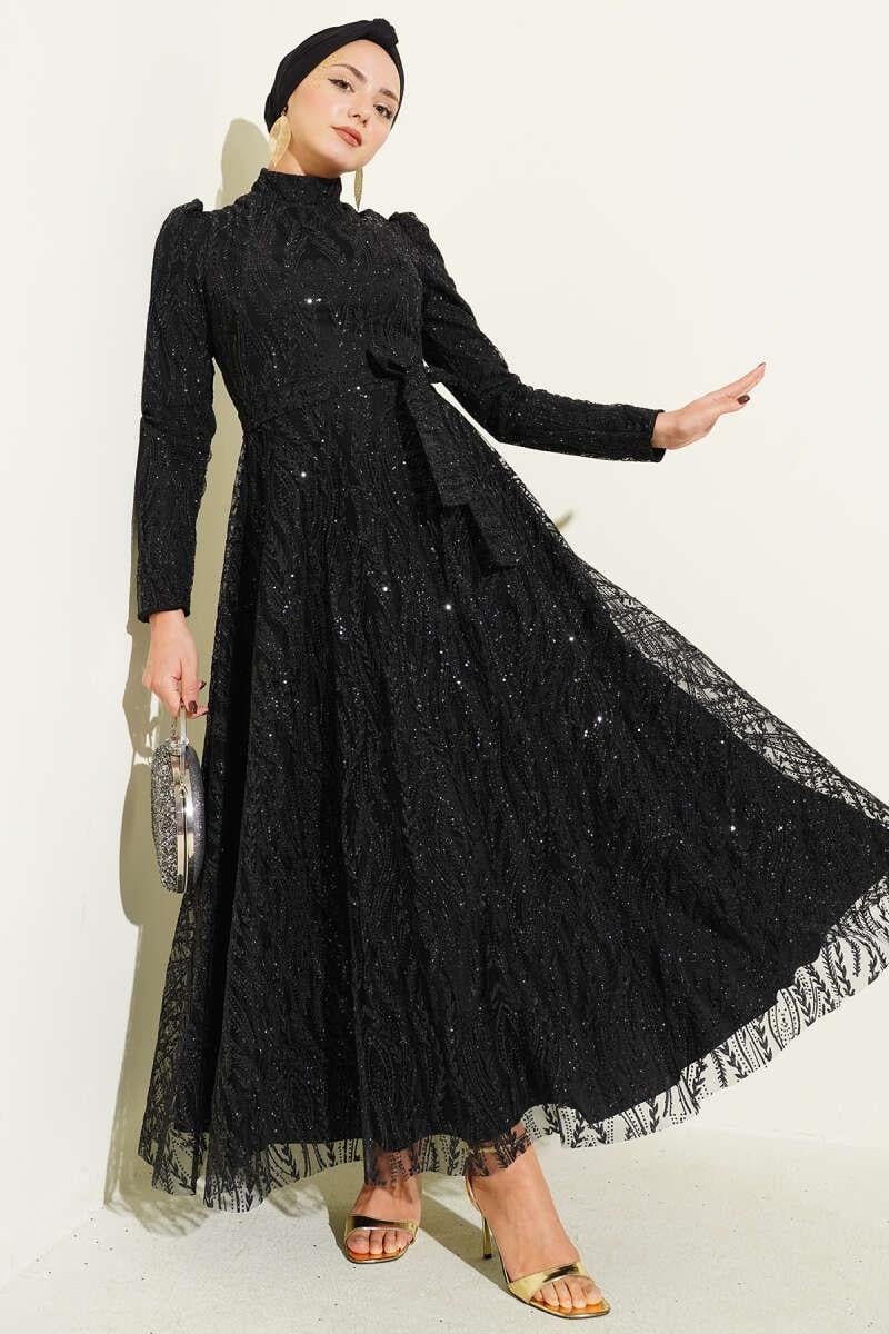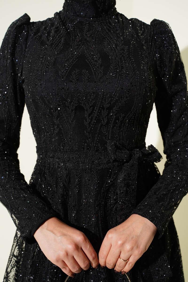 Belted Glittery Sequined Evening Dress Black (8163-4451-693534)