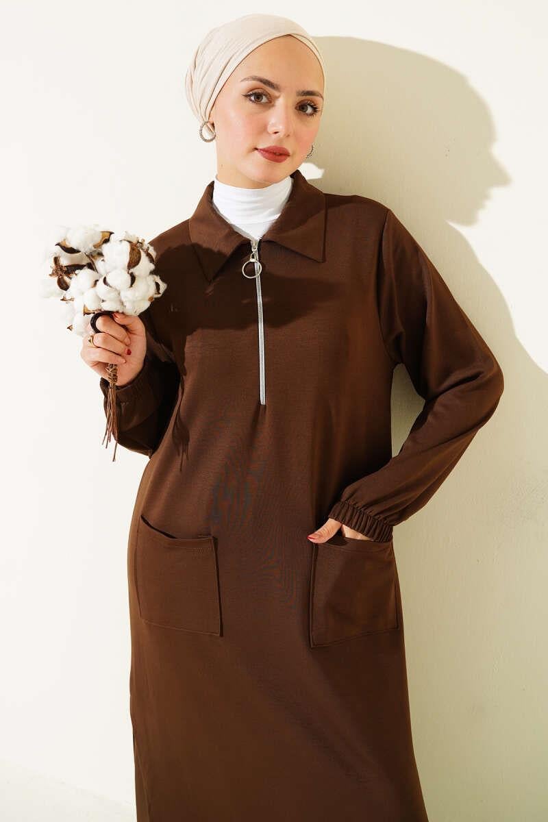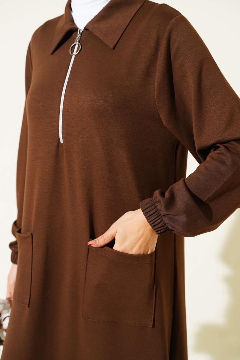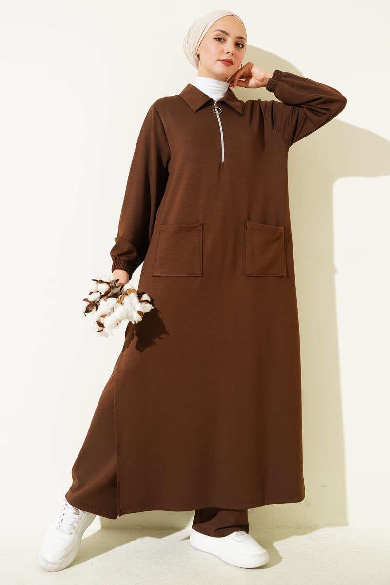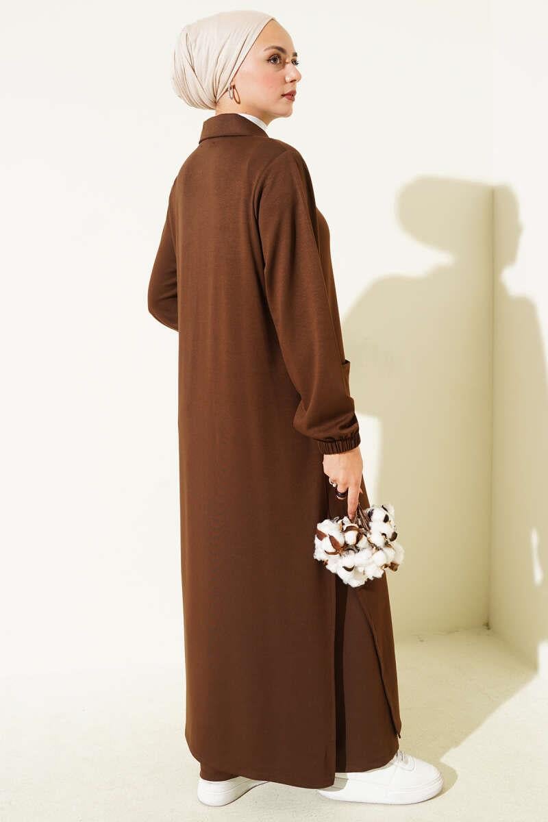 LLoysha Pocketed Long Tunic 2 Piece Set Brown (0829-5313-679157)
