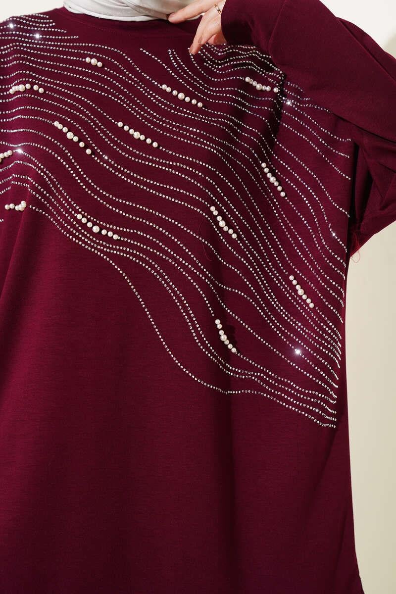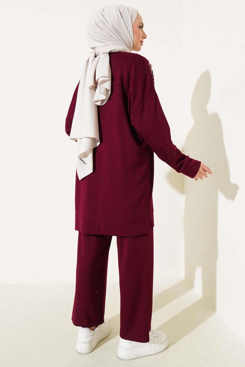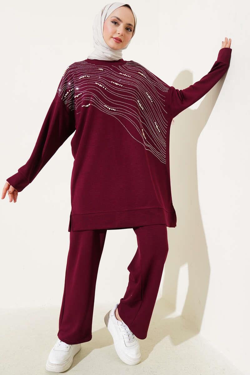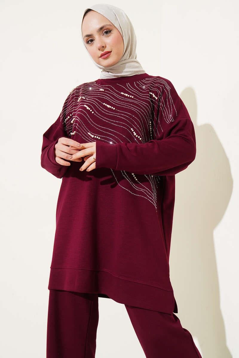 Loyşa Stoned Pearl Front Tunic 2 Piece Set Burgundy (8090-214-616058)