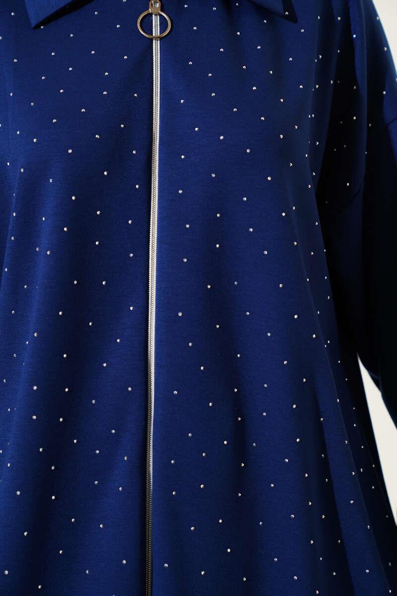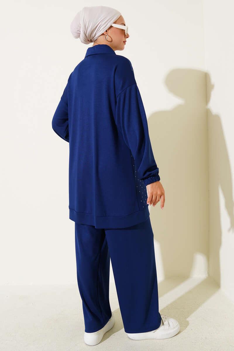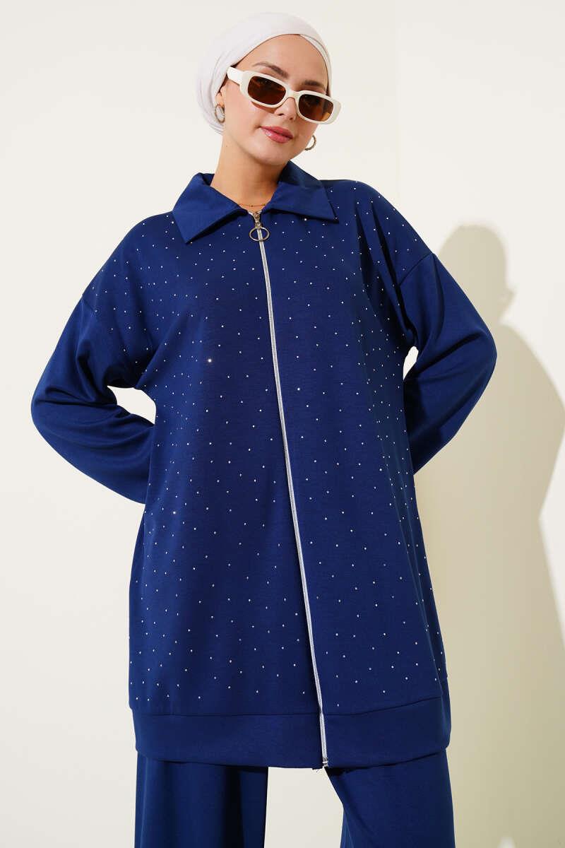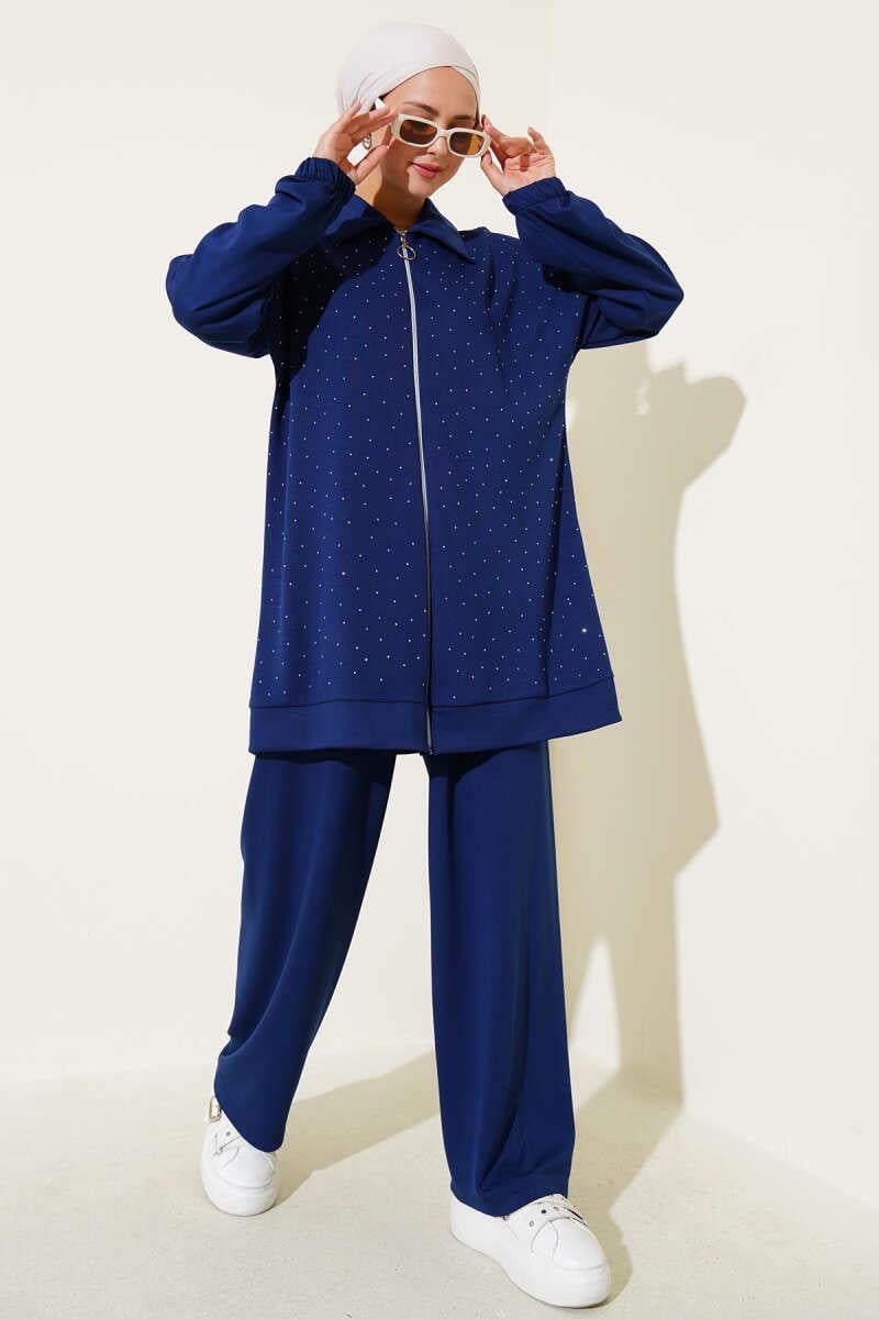Loyşa Stone Embellished Zippered 2 Piece Set Navy Blue (0829-5309-666147)