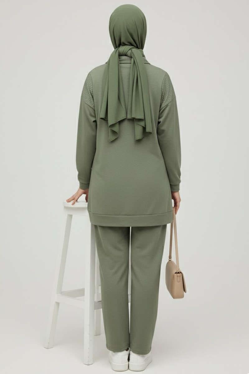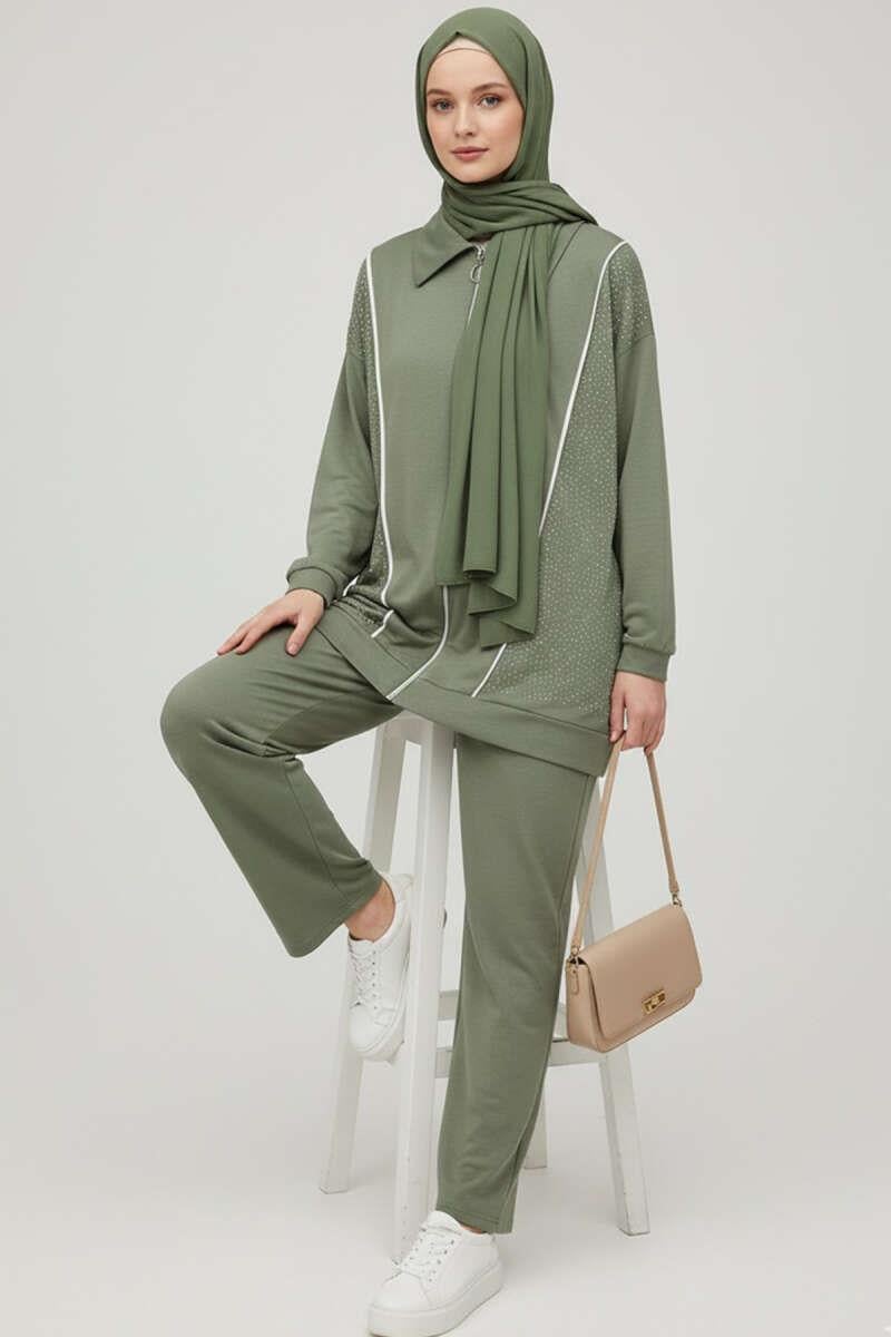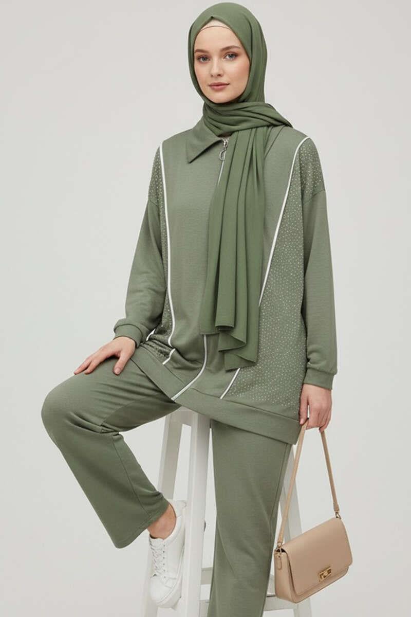 Loysha Stoned Zippered 2 Piece Set, Almond Green (0829-5372-670237)
