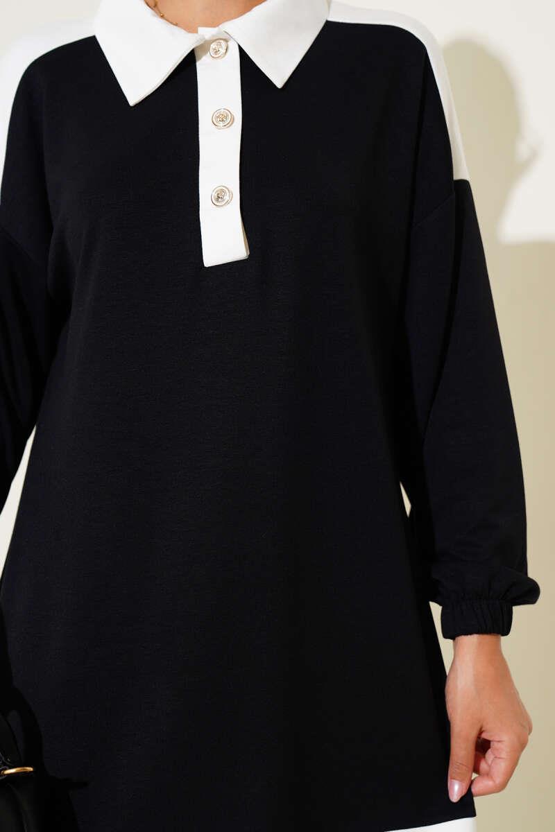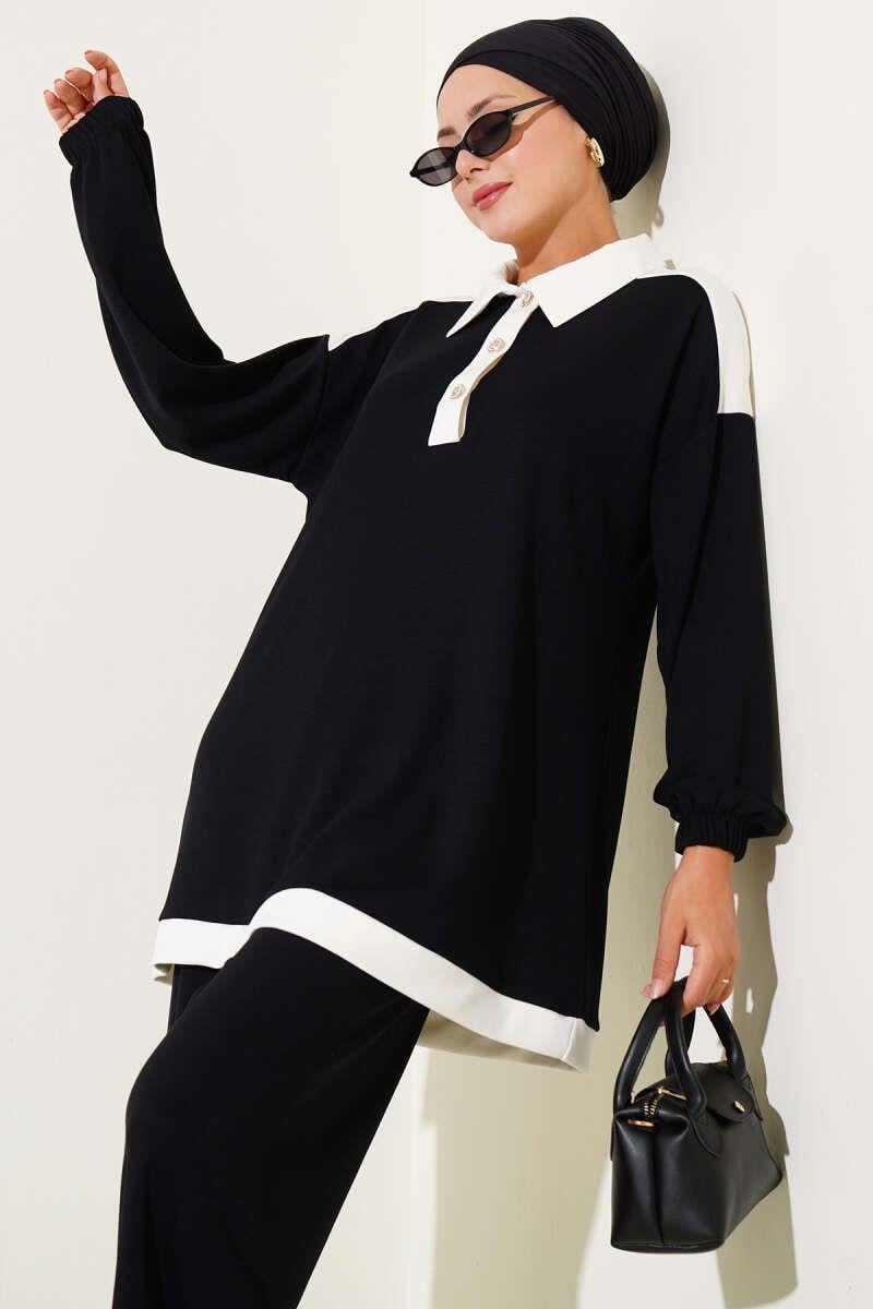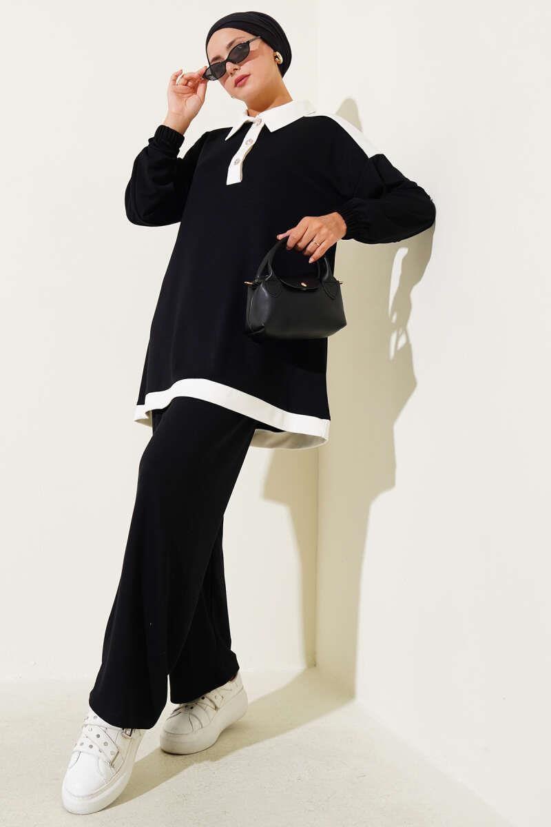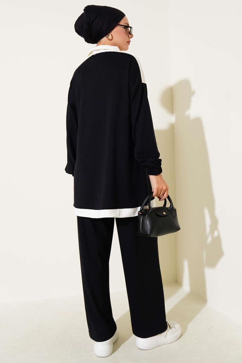Loyşa Half Buttoned Stripe Detailed 2 Piece Set Black (0829-5314-666112)