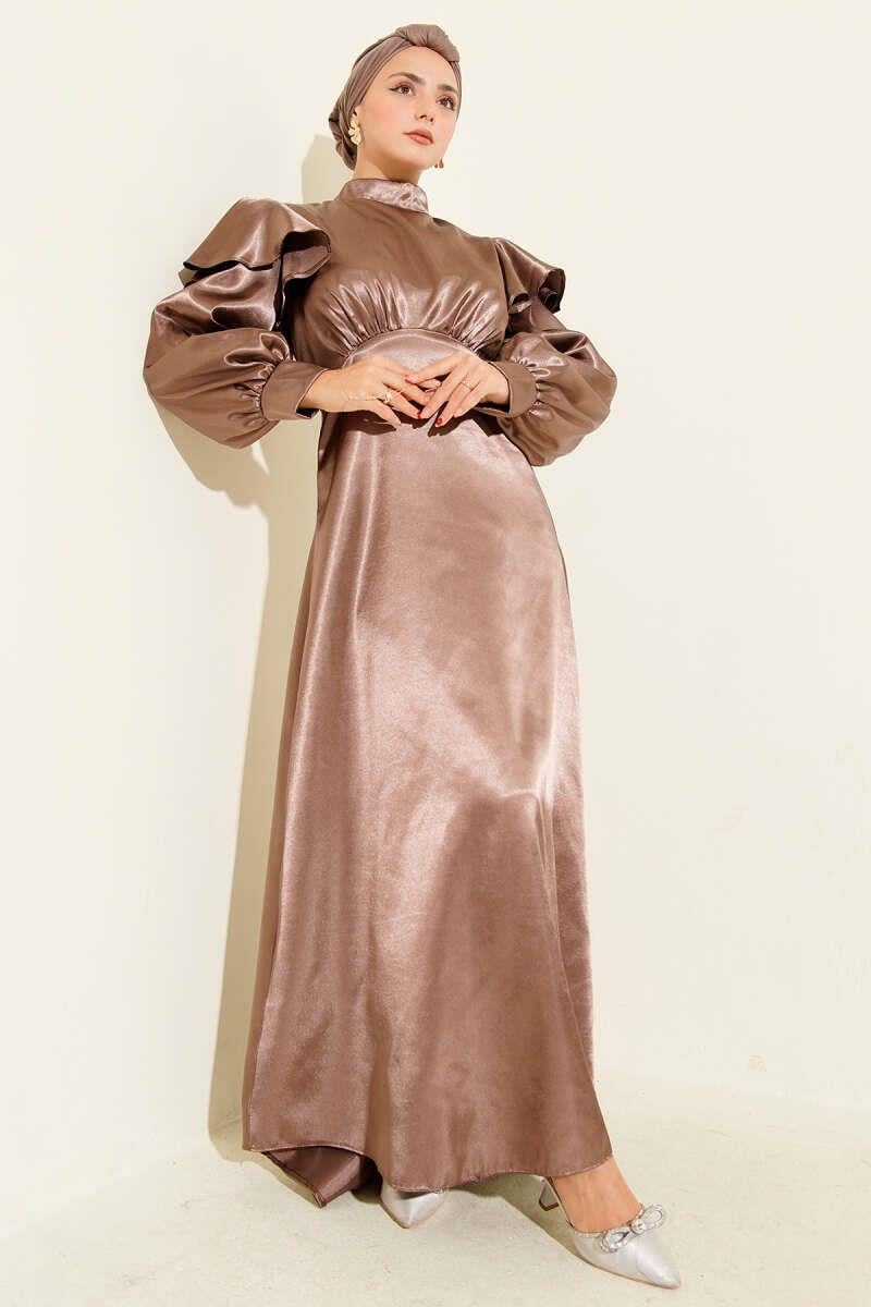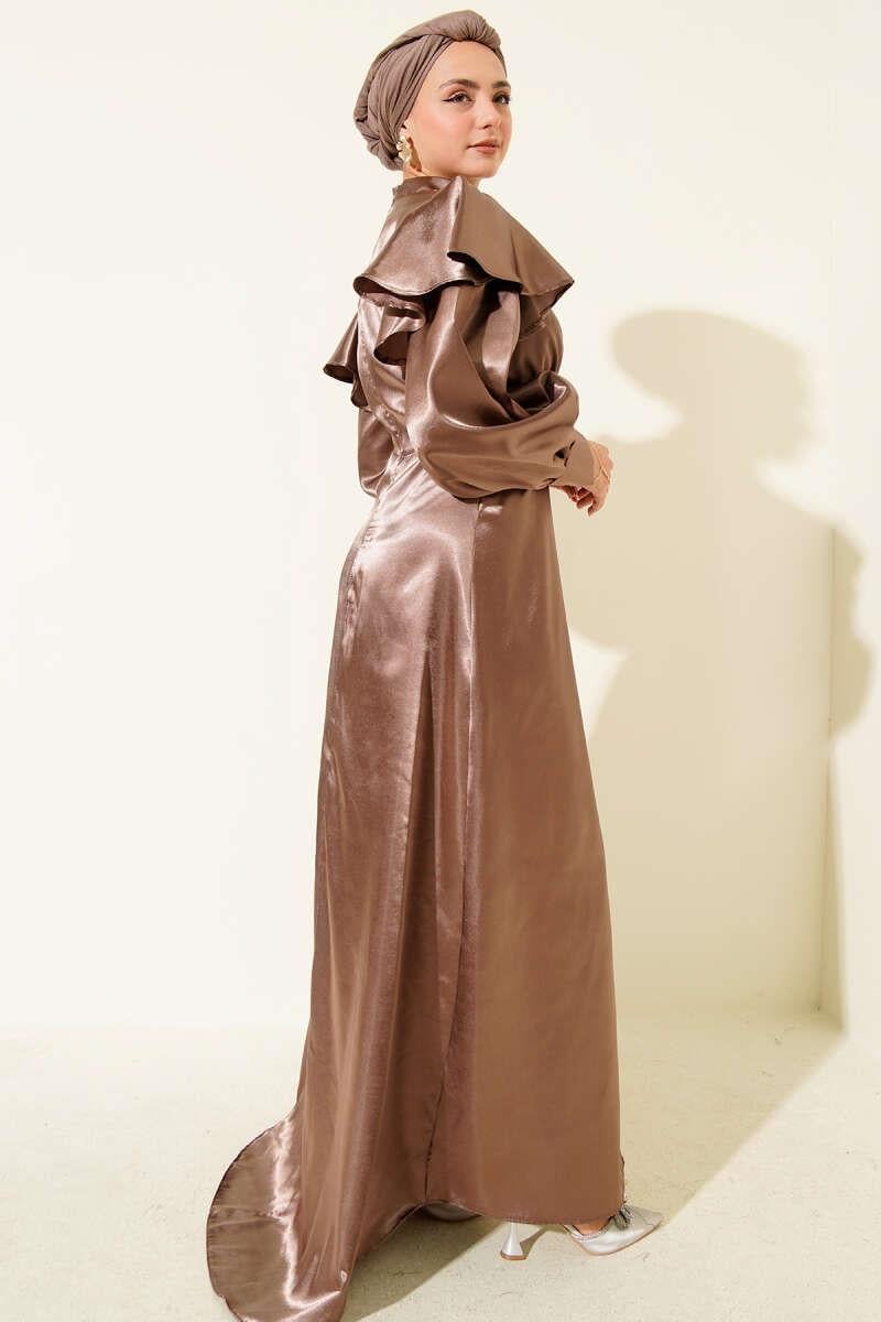 Satin Evening Dress with Ruffled Shoulders, Light Brown (8163-6003-672584)