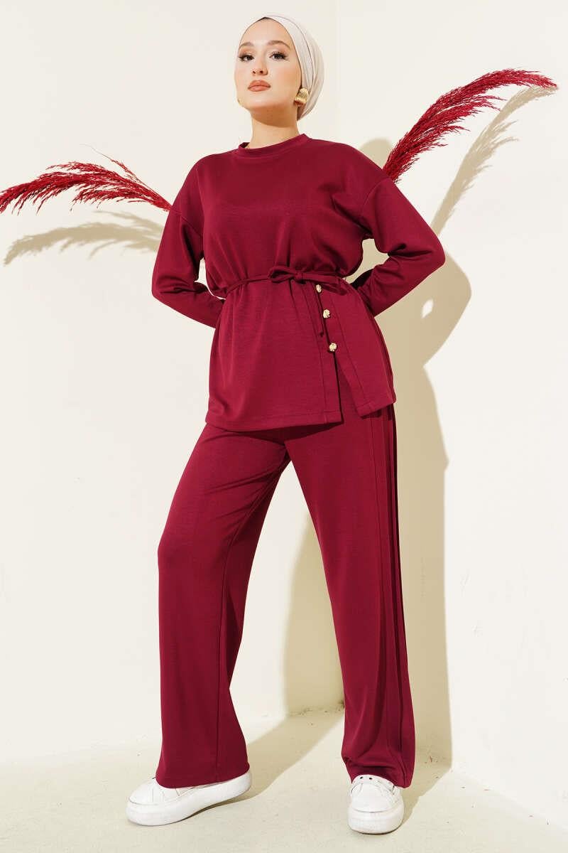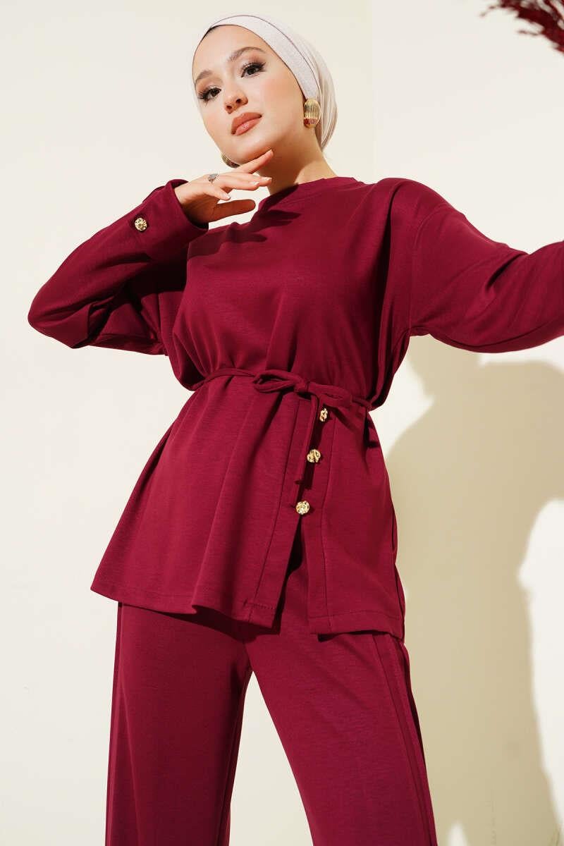 Button Detailed Front Laced 2 Piece Set Burgundy (0428-8218-676312)