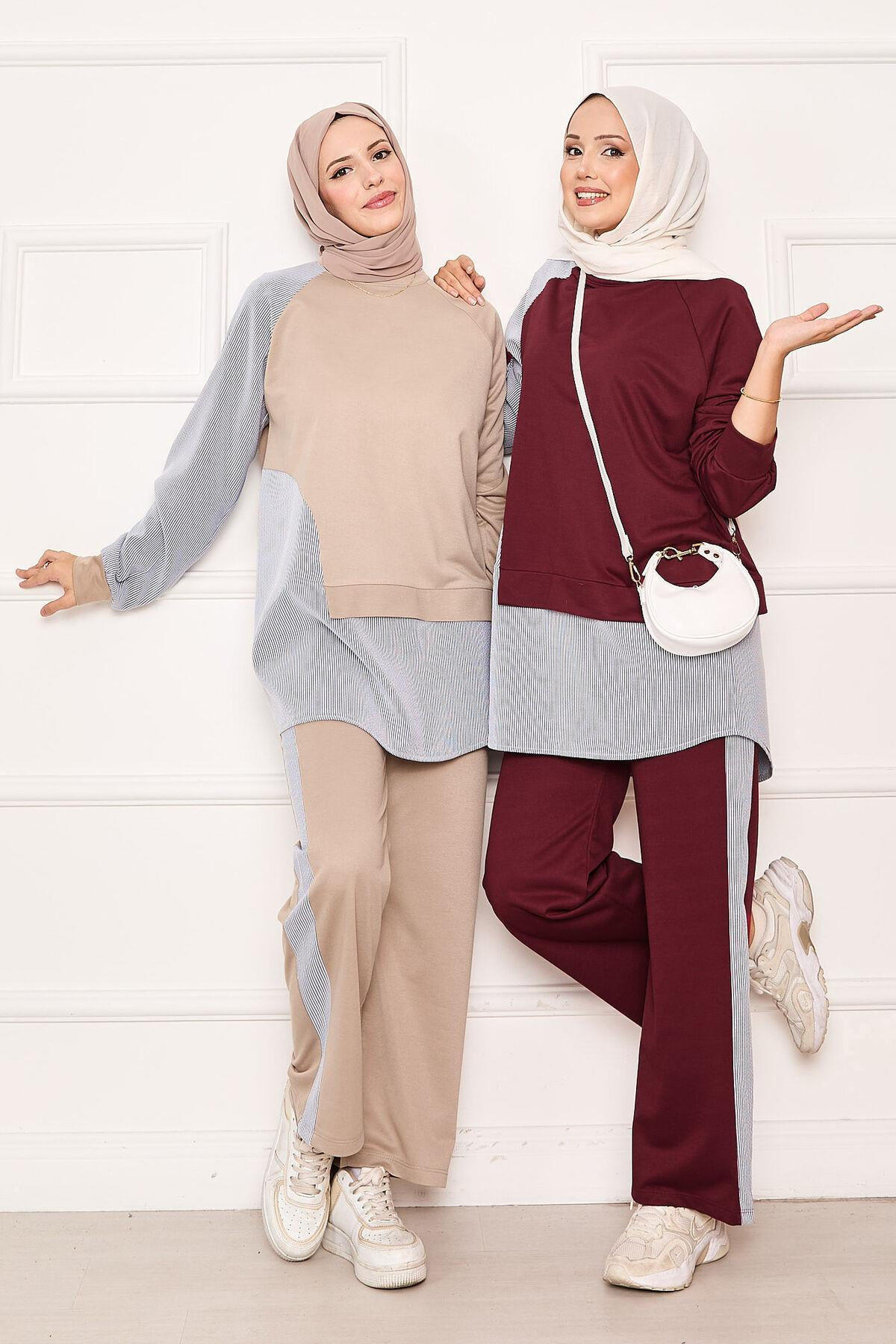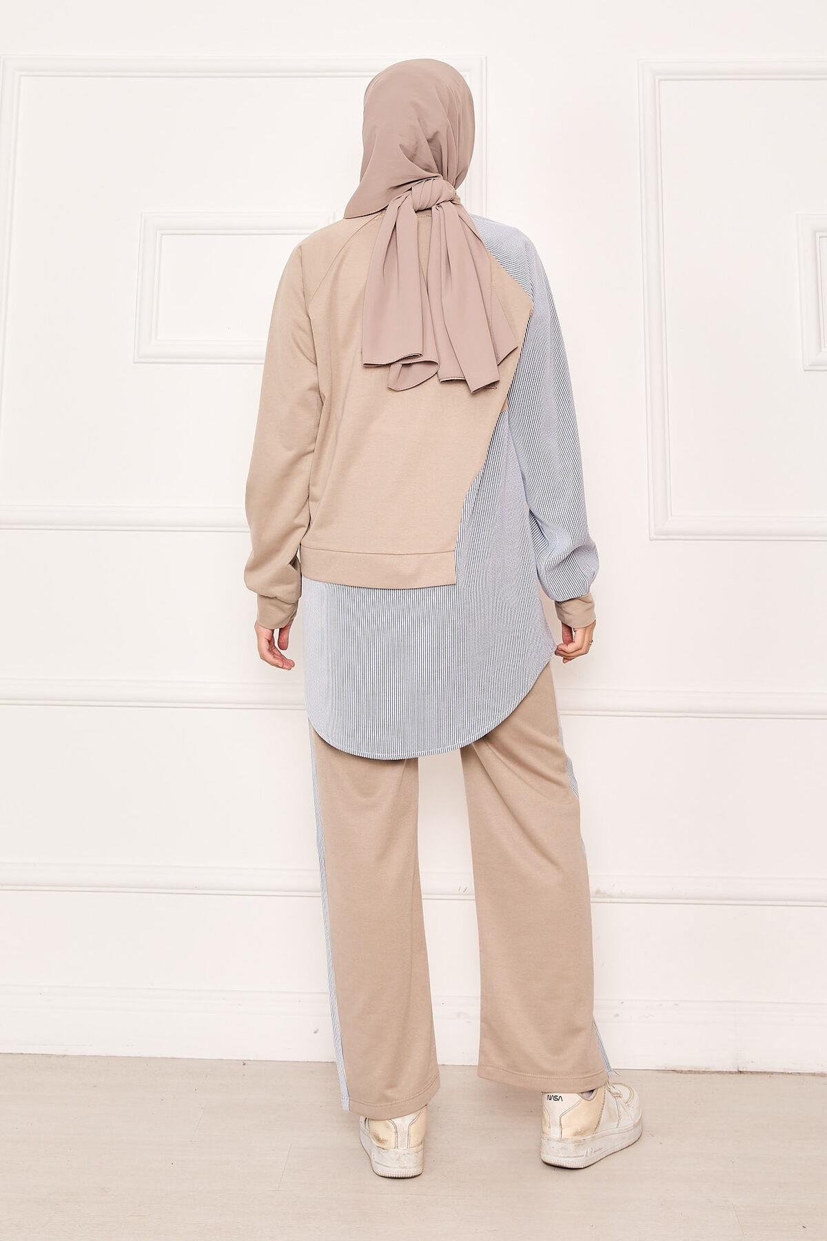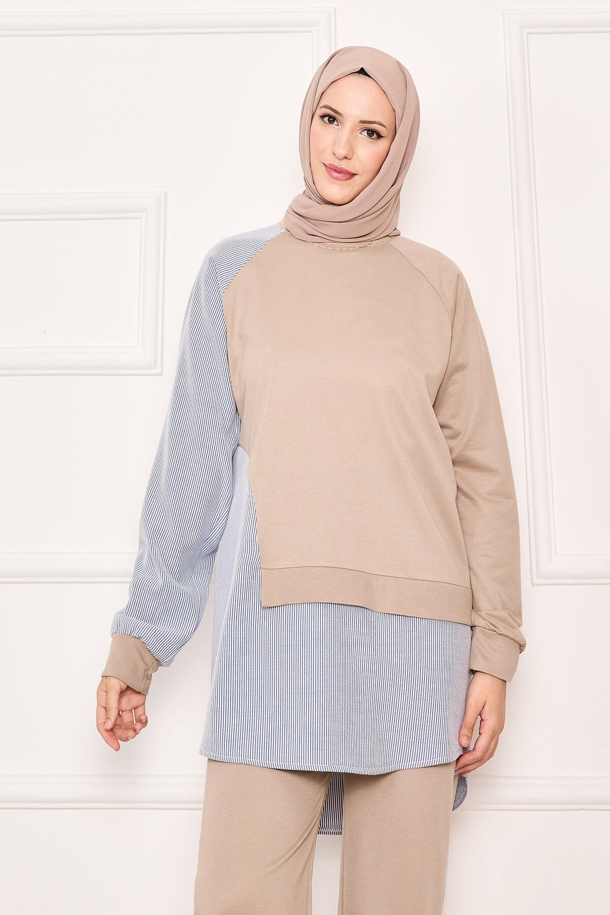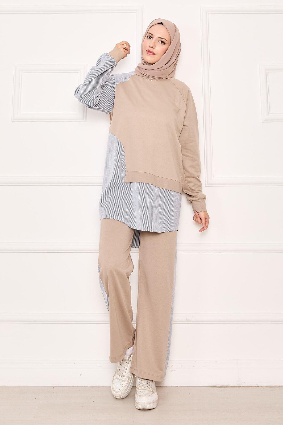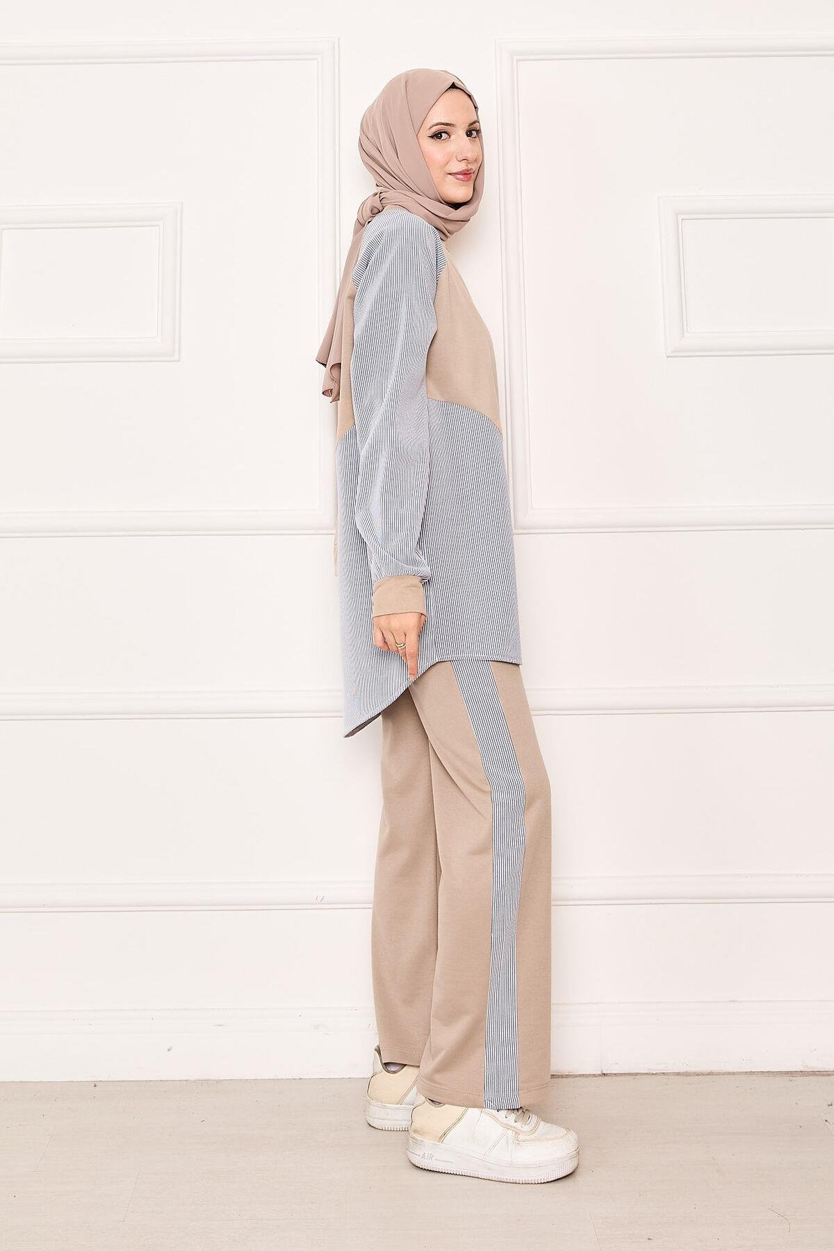 • The product is seasonal. It consists of two pieces: tunic and trousers. An asymmetrical design with striped details, this sports combination features striped garter detailing. The trousers have an elastic waistband. It is not see-through.