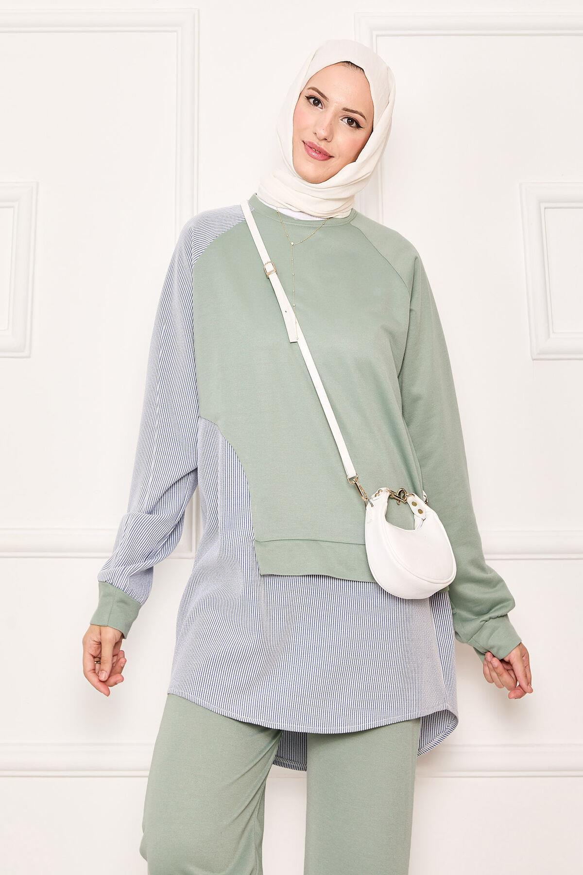 • The product is seasonal. It consists of two pieces: tunic and trousers. An asymmetrical design with striped details, this sports combination features striped garter detailing. The trousers have an elastic waistband. It is not see-through.