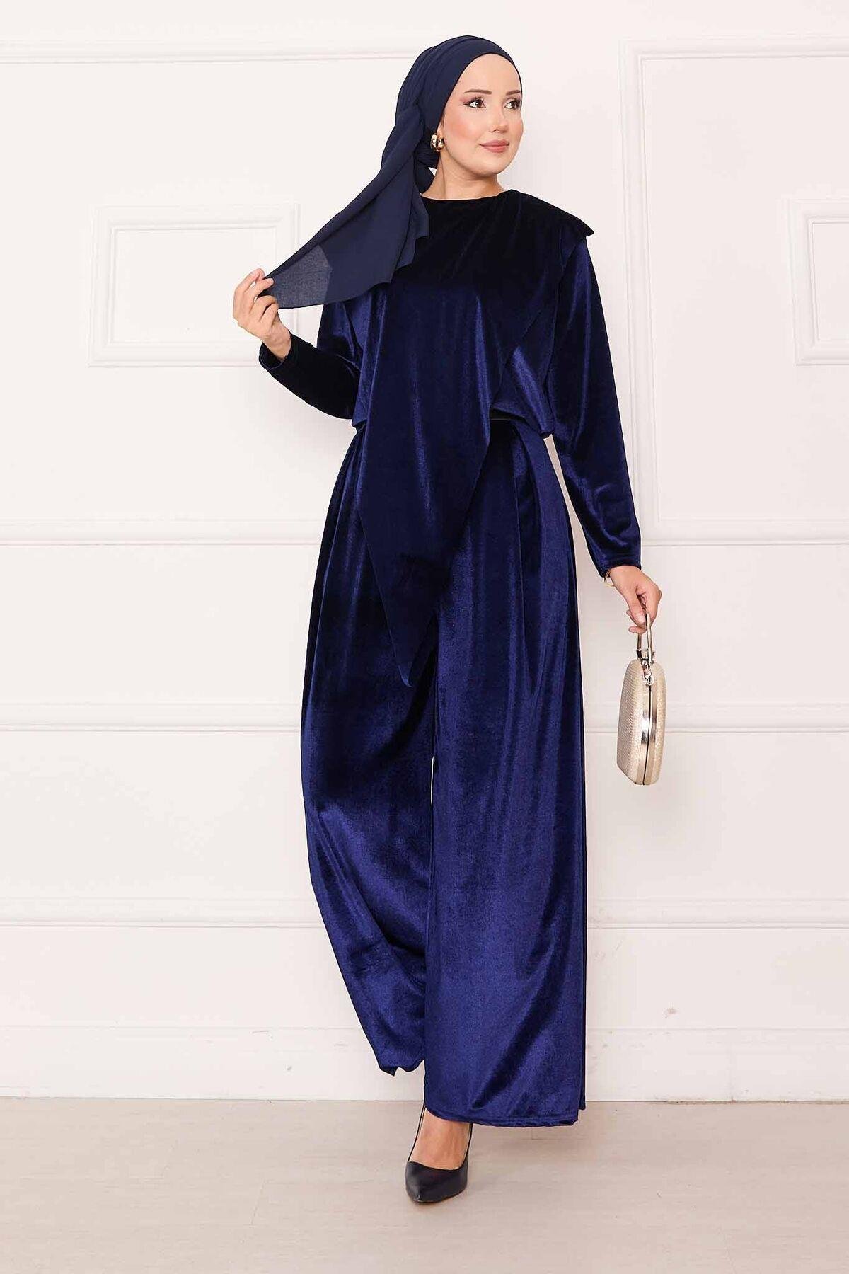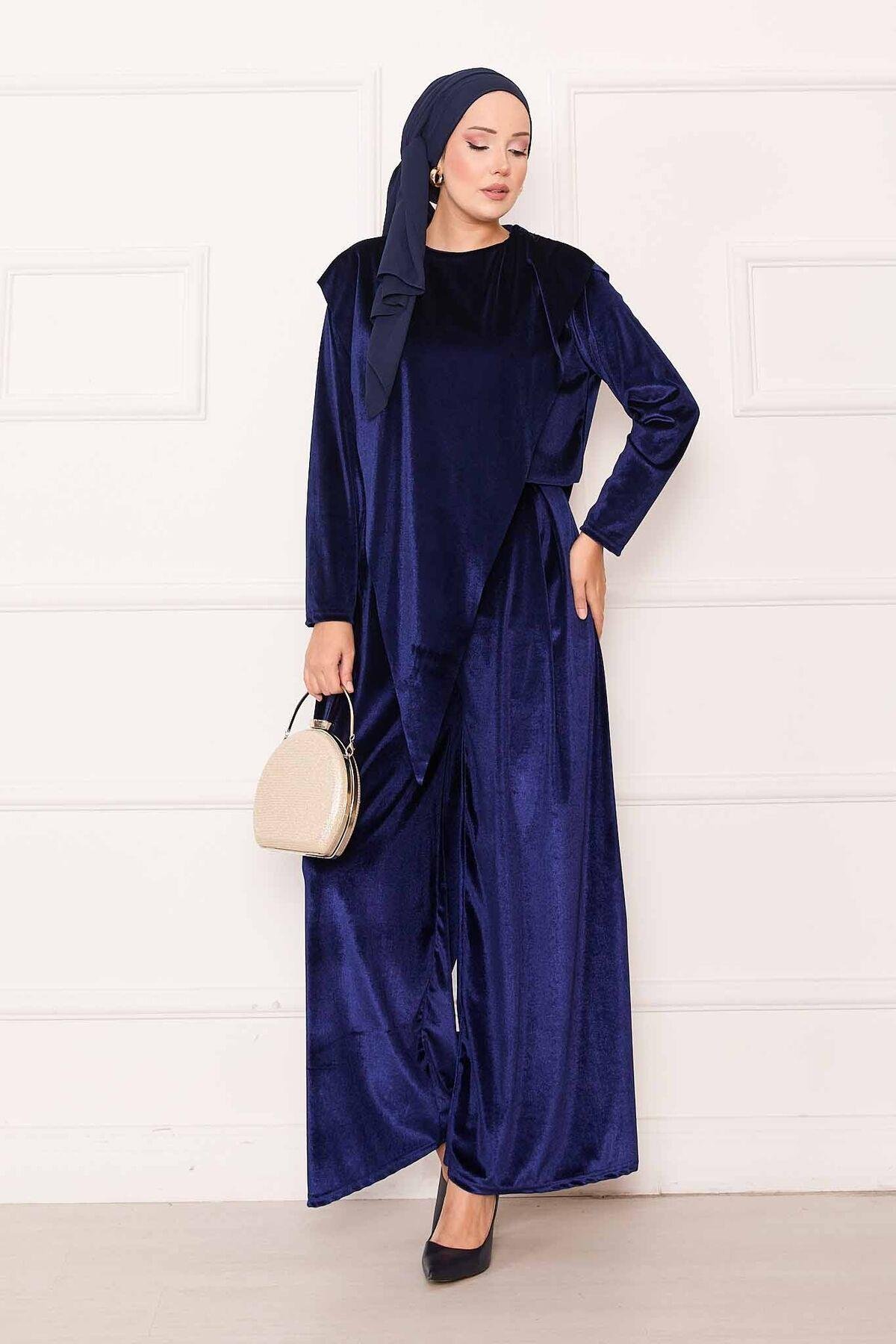 Velvet 2 Piece Set with Asymmetrical Front Detail, Navy Blue (125M00611031R331)