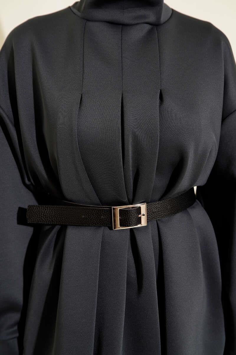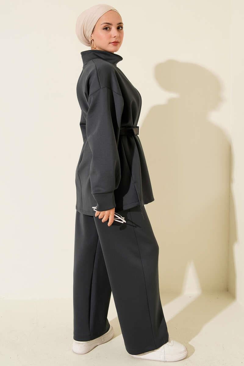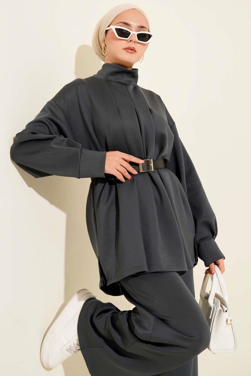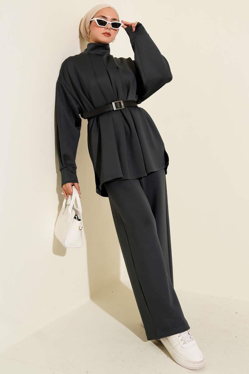 Pleated Belted Scuba 2 Piece Set in Smoke (8163-0765-679457)