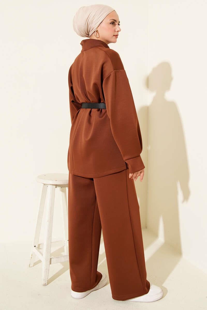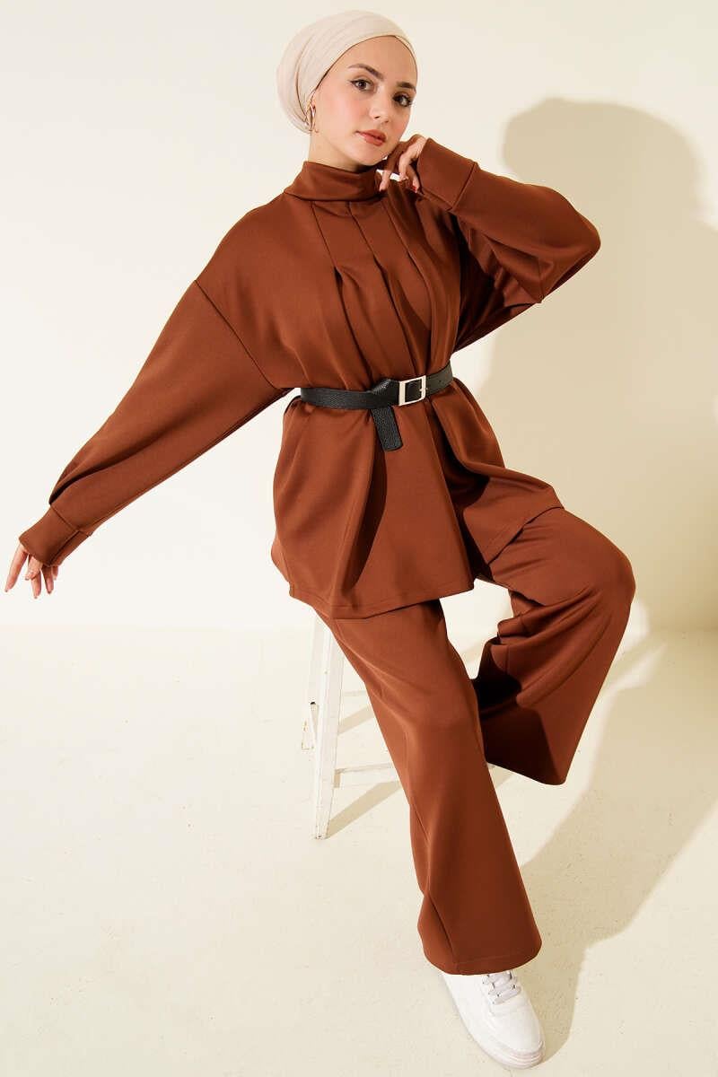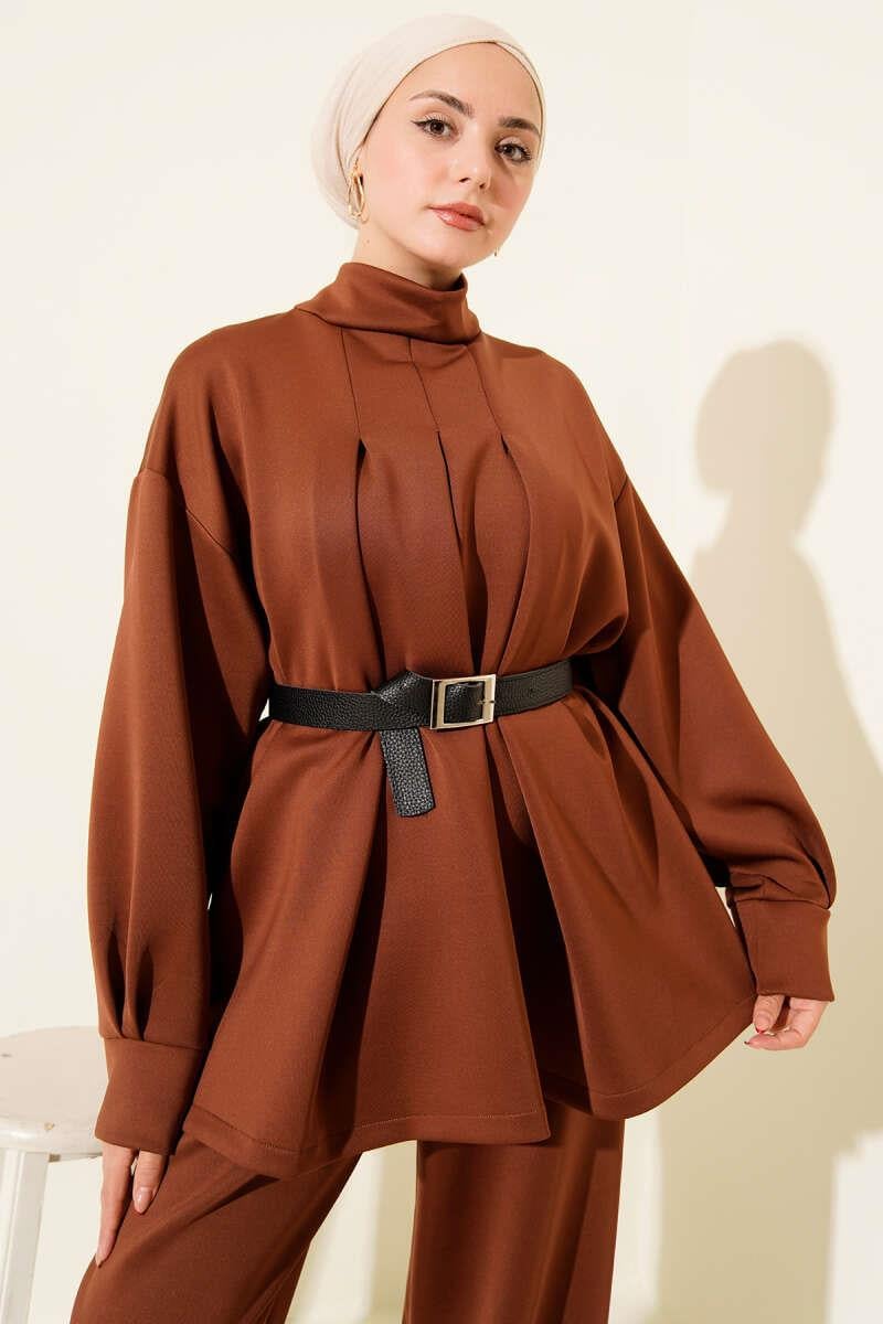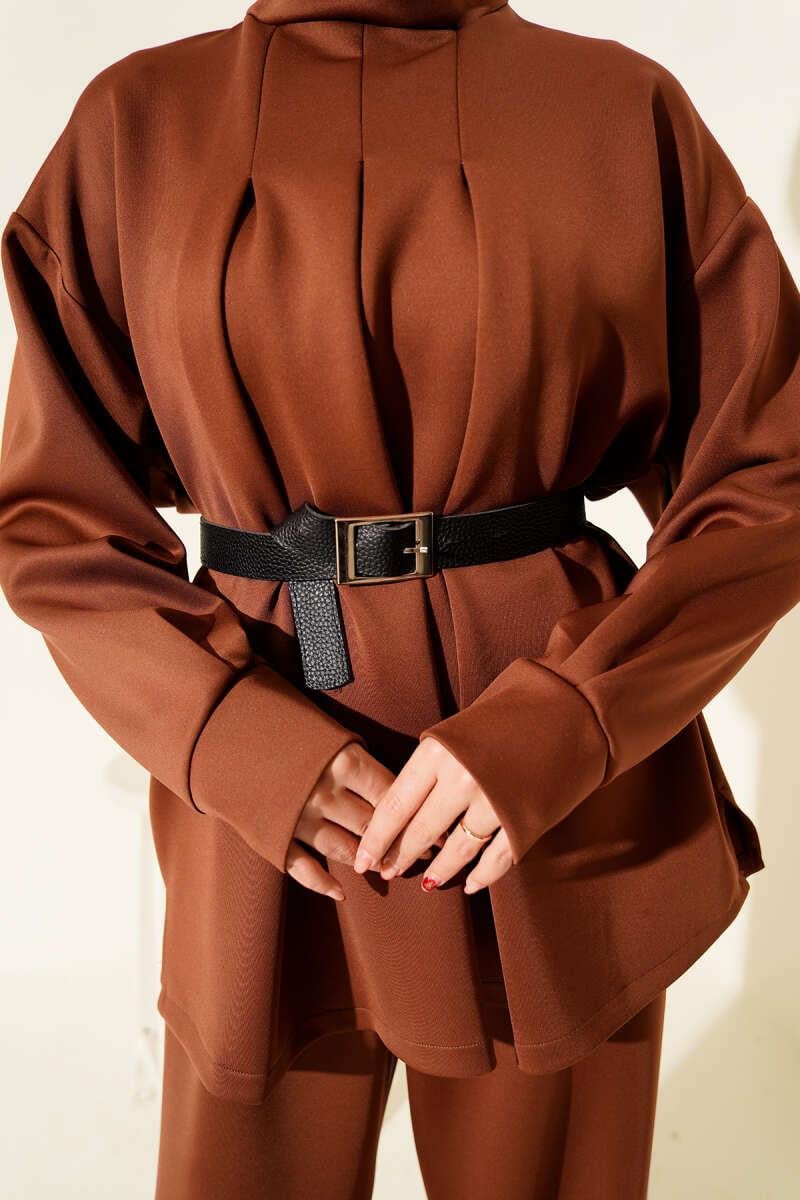 Pleated Belted Scuba 2 Piece Set Brown (8163-0765-679465)