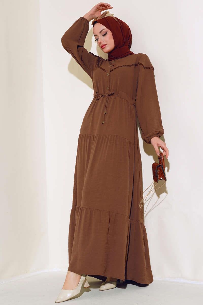Our new season dress is here for you with its wonderful design. The front of our dress is half-buttoned. The waist of our dress has a tunnel and rope ties. The wrists are elastic. It has a stand-up collar. Our dress is a layered model. It is unlined. Our simple and elegant dress is waiting for its place in your wardrobe with color options.