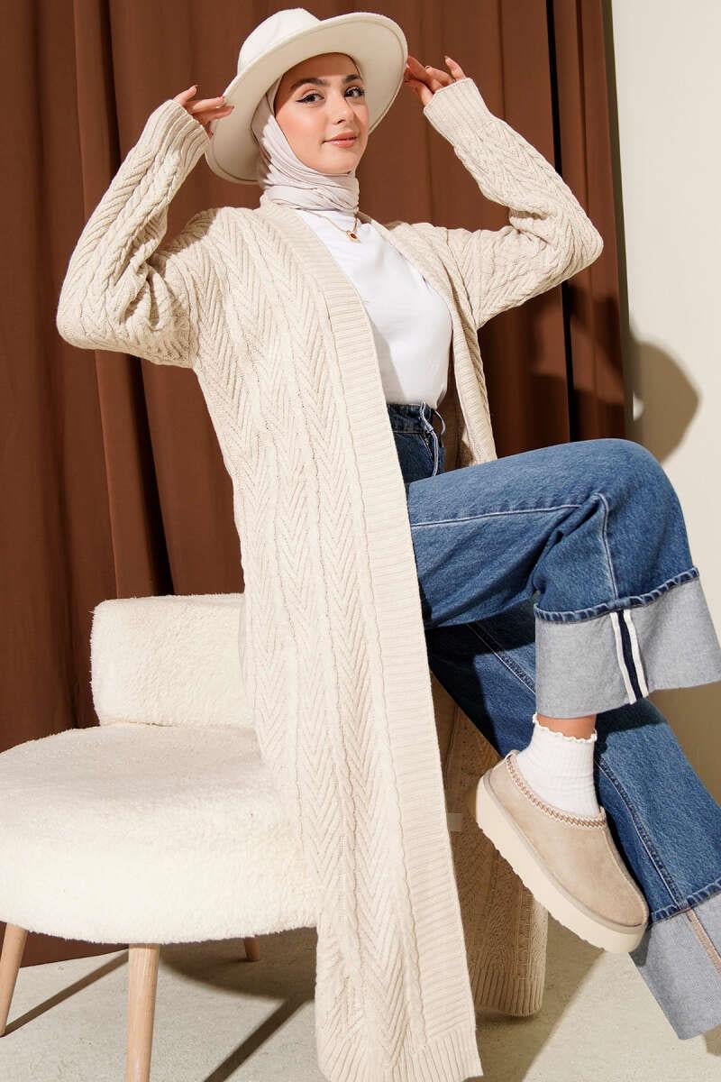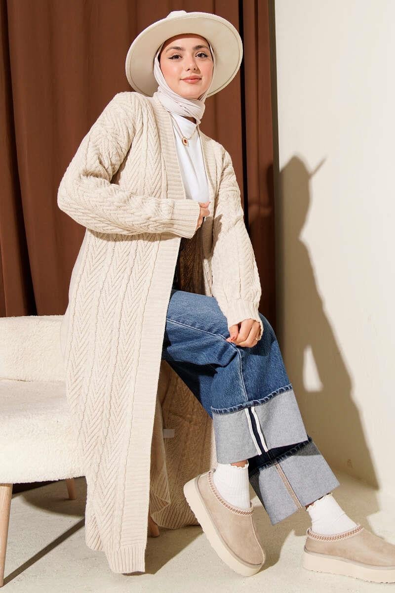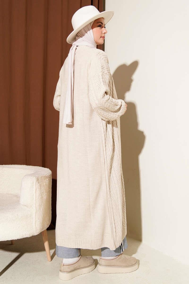 Knitted Shirred Long Knitwear Cardigan Stone (0875-4350-677096)