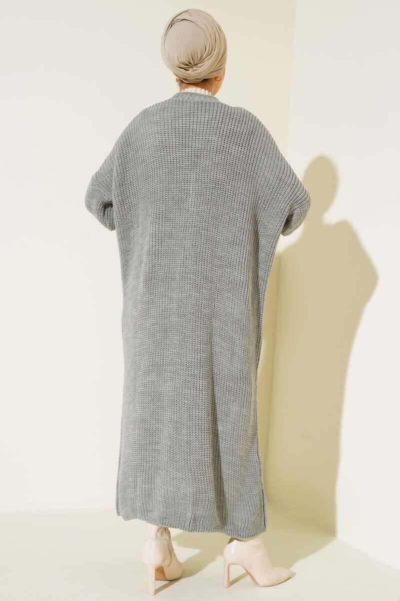 The new season cardigan is navy blue. The knitted cardigan is a buttoned model. It has a loose cut, low It has elasticated ribbed sleeves and double pockets. There are wide color alternatives.