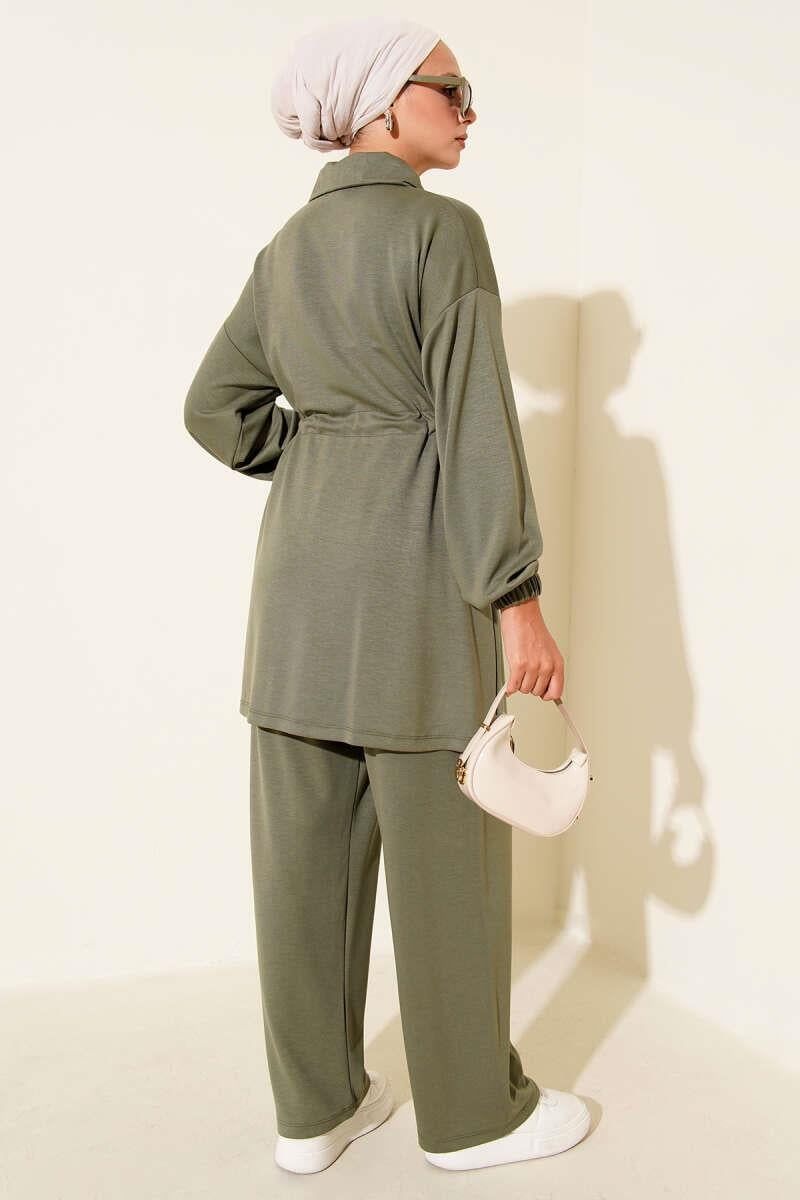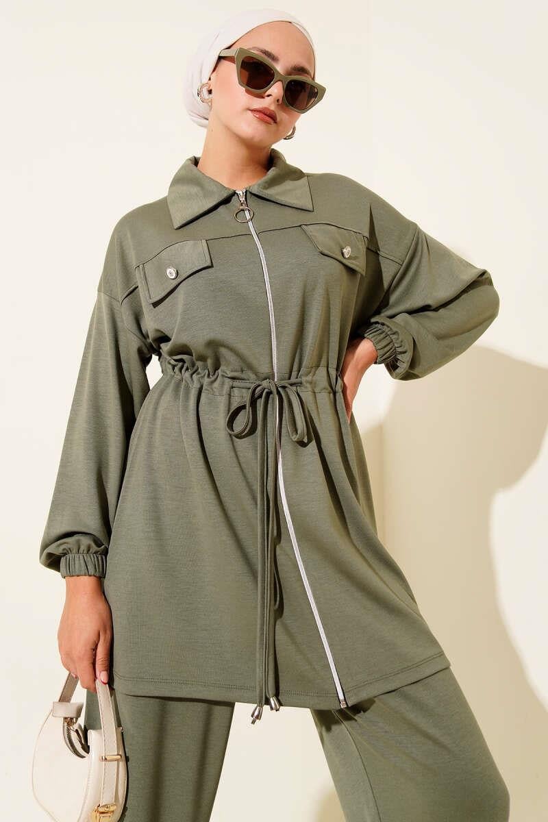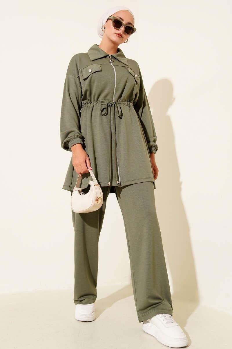 Fake Pocket Zippered Loysha 2 Piece Set, Almond Green (0829-5315-666048)