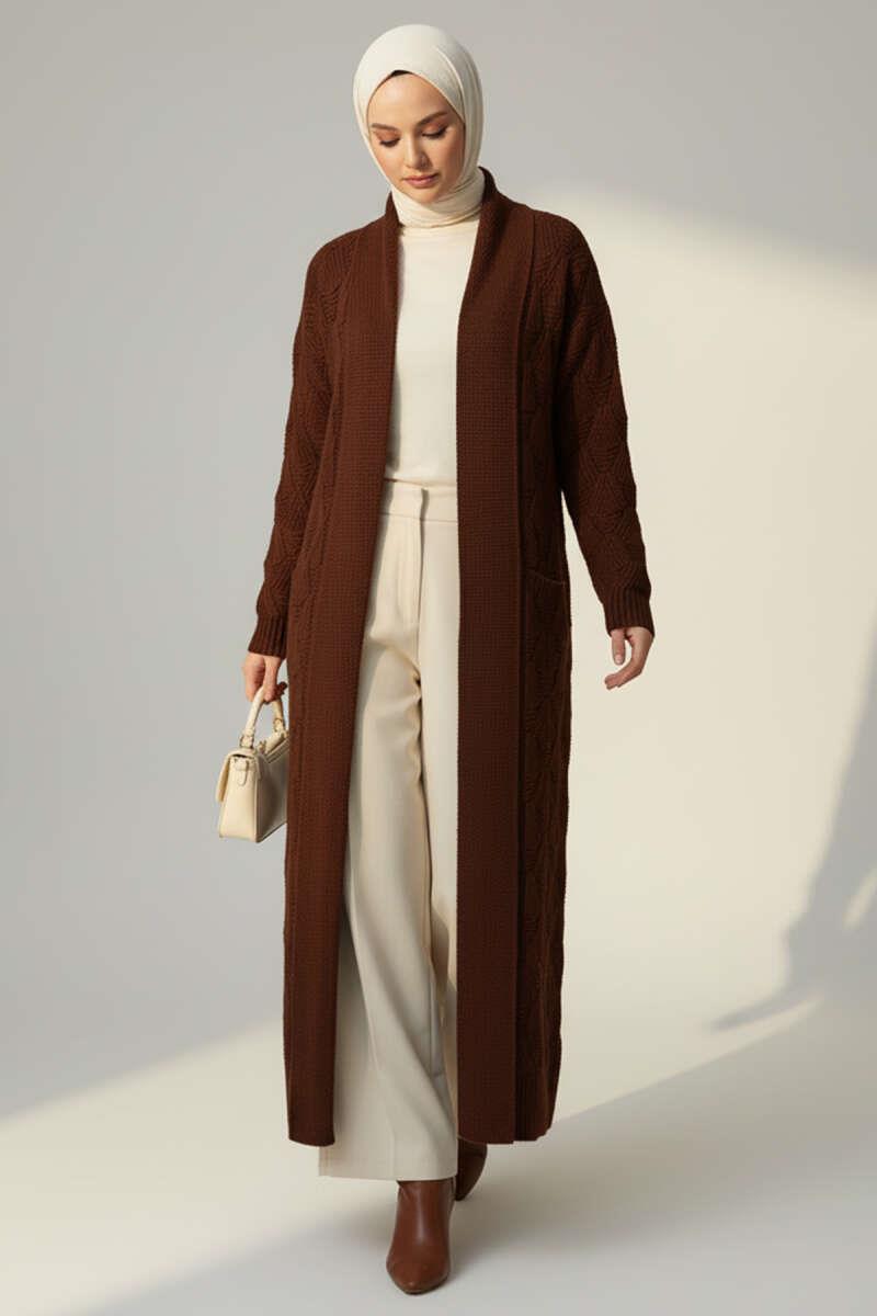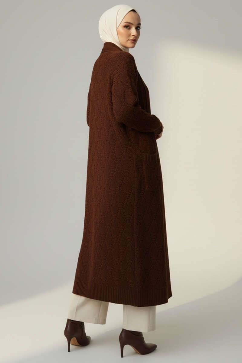 Shawl Collar Knitted Patterned Long Knitwear Cardigan Brown (0875-4393-669700)