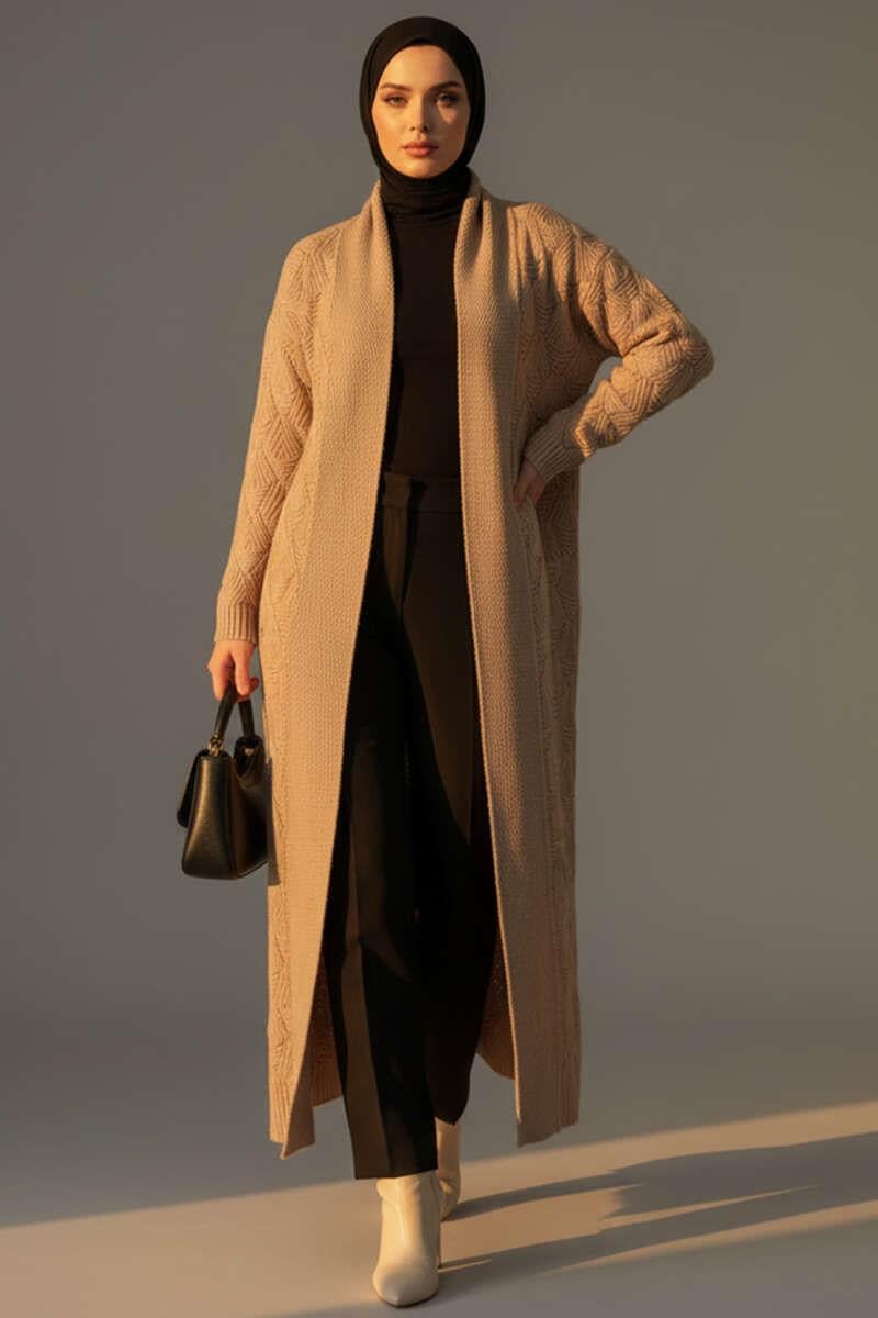 Shawl Collar Knitted Patterned Long Knit Cardigan Latte (0875-4393-669698)