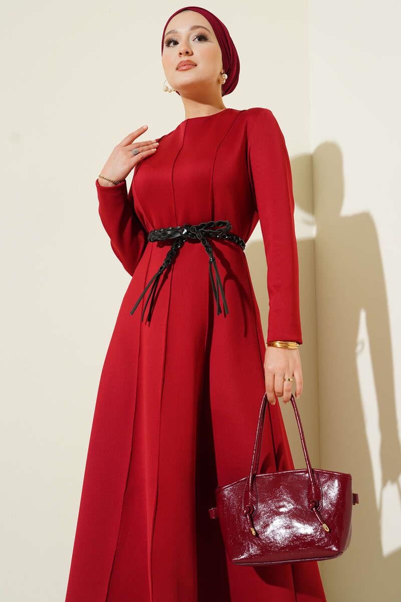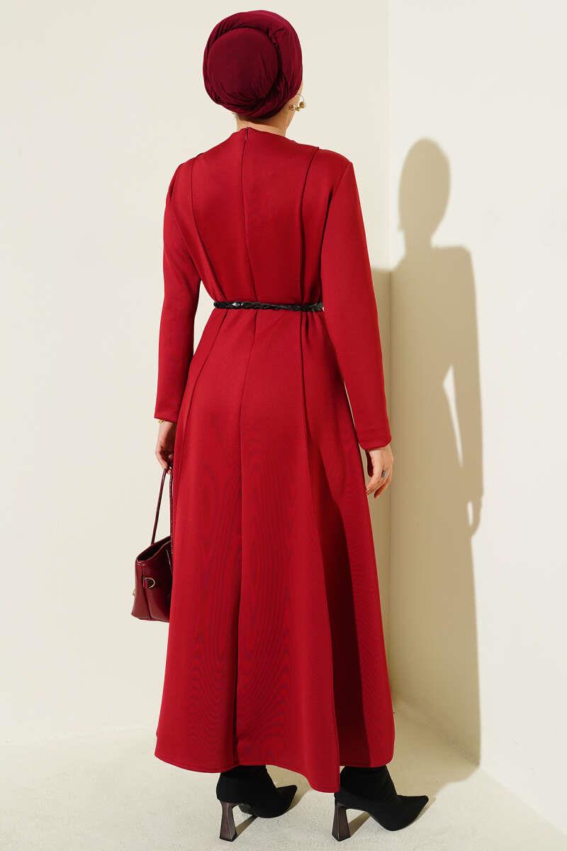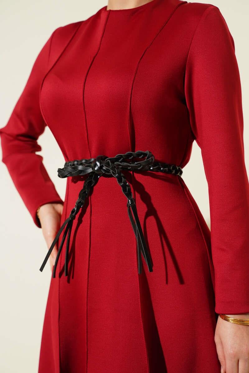 Scuba Leather Belted Dress Burgundy (8209-2010-683459)