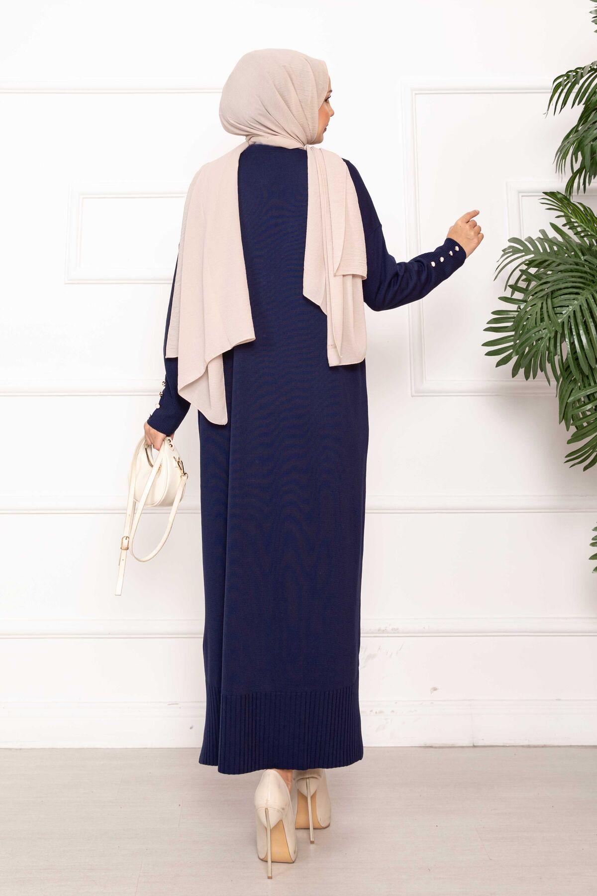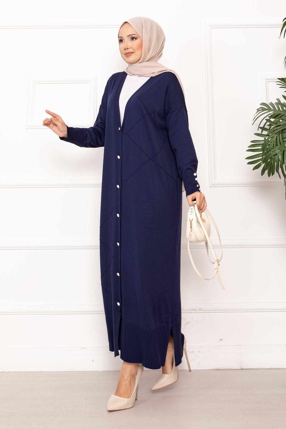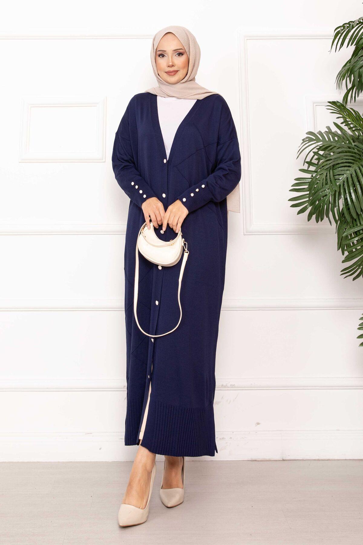 Long Knitted Cardigan with Pearl Buttons, Navy Blue (125M00924354R33STD)