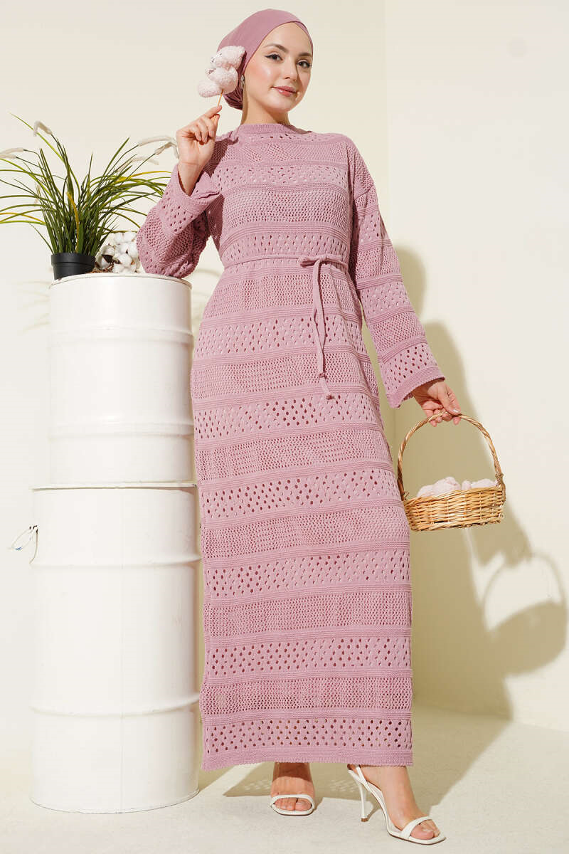 Striped Openwork Pattern Knitted Dress Powder Pink (0875-4497-723791)