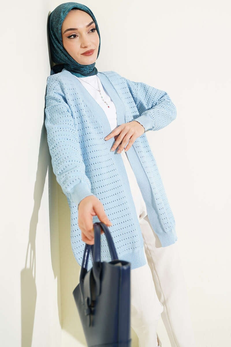 With its elegant perforated knit texture extending to the neck, it boasts a stylish design that offers both breathability and visual depth. The wide ribbed cuff details at the wrists balance the cardigan's flowing form while giving the sleeves a modern silhouette. Thanks to its lightweight structure, this model is an ideal complement for transitional seasons and easily adapts to every style, from everyday denim combinations to more classic choices. Model Information: Height: 162 cm, Chest: 82 cm, Waist: 65 cm, Hips: 90 cm. The product on the model is size - Standard -.