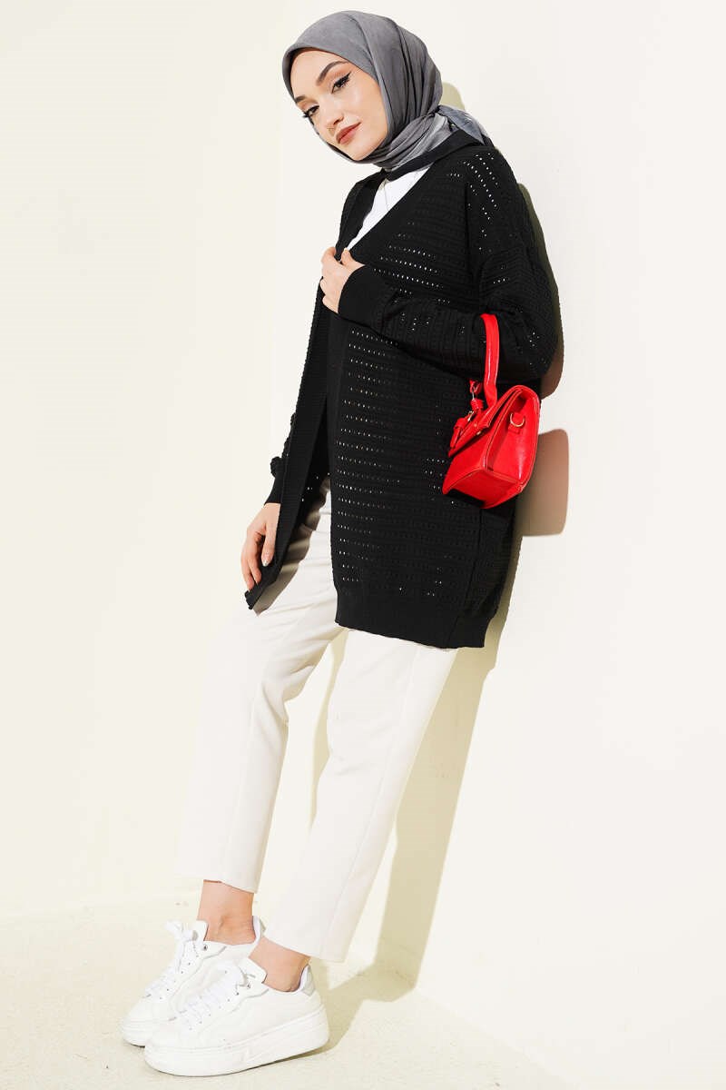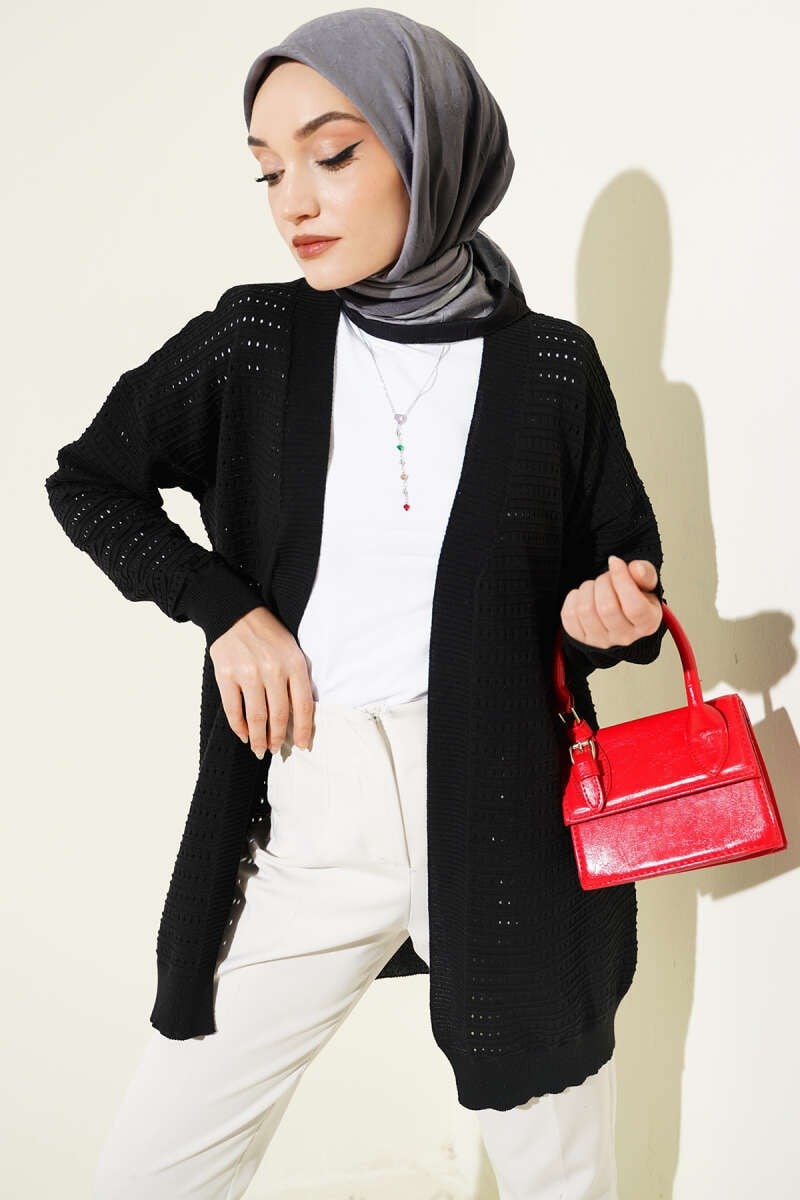 With its elegant perforated knit texture extending to the neck, it boasts a stylish design that offers both breathability and visual depth. The wide ribbed cuff details at the wrists balance the cardigan's flowing form while giving the sleeves a modern silhouette. Thanks to its lightweight structure, this model is an ideal complement for transitional seasons and easily adapts to every style, from everyday denim combinations to more classic choices. Model Information: Height: 162 cm, Chest: 82 cm, Waist: 65 cm, Hips: 90 cm. The product on the model is size - Standard -.