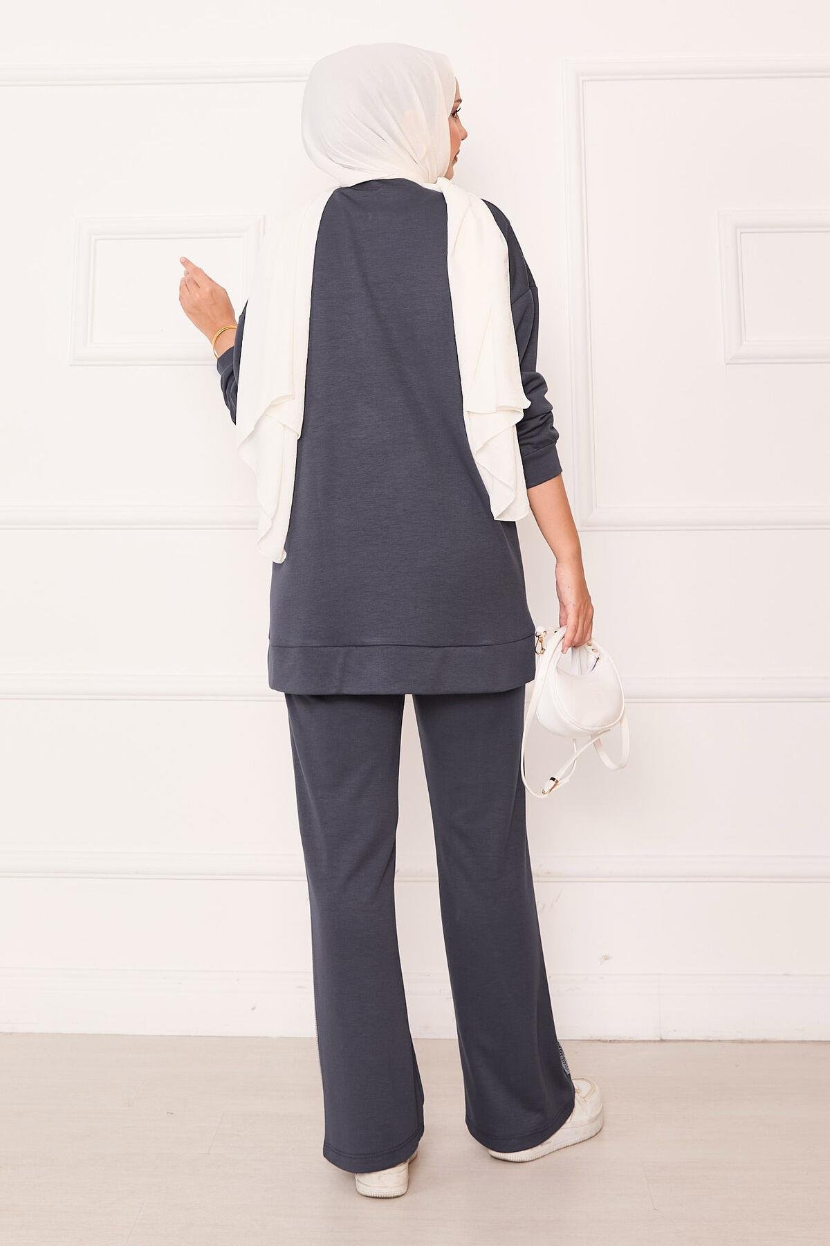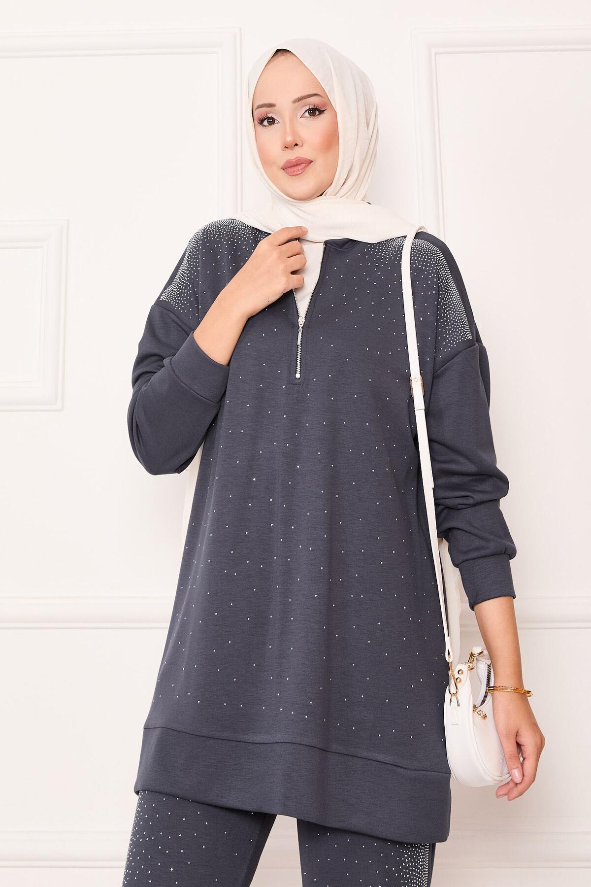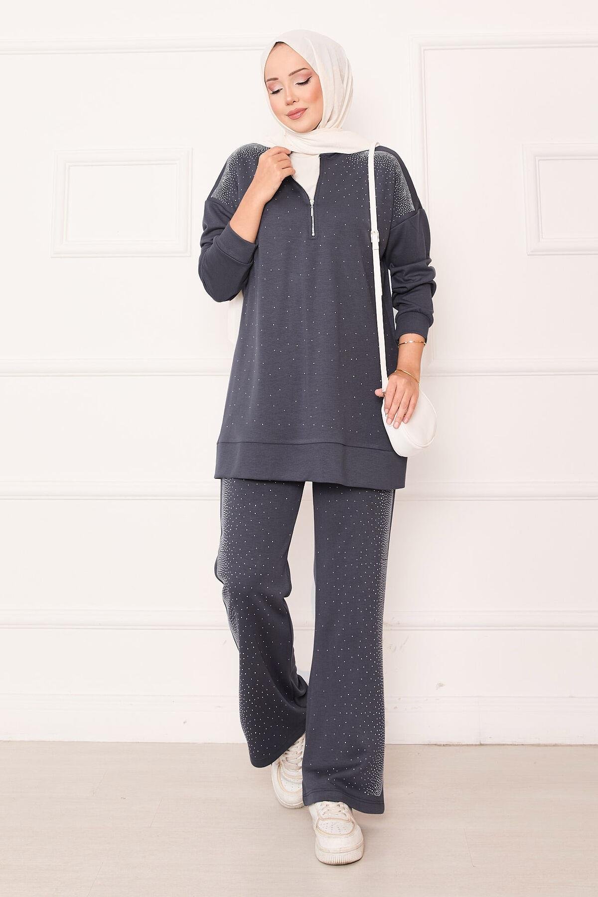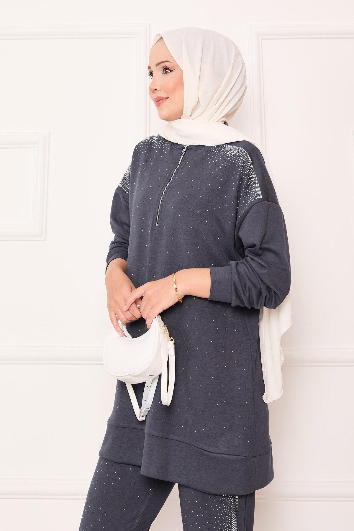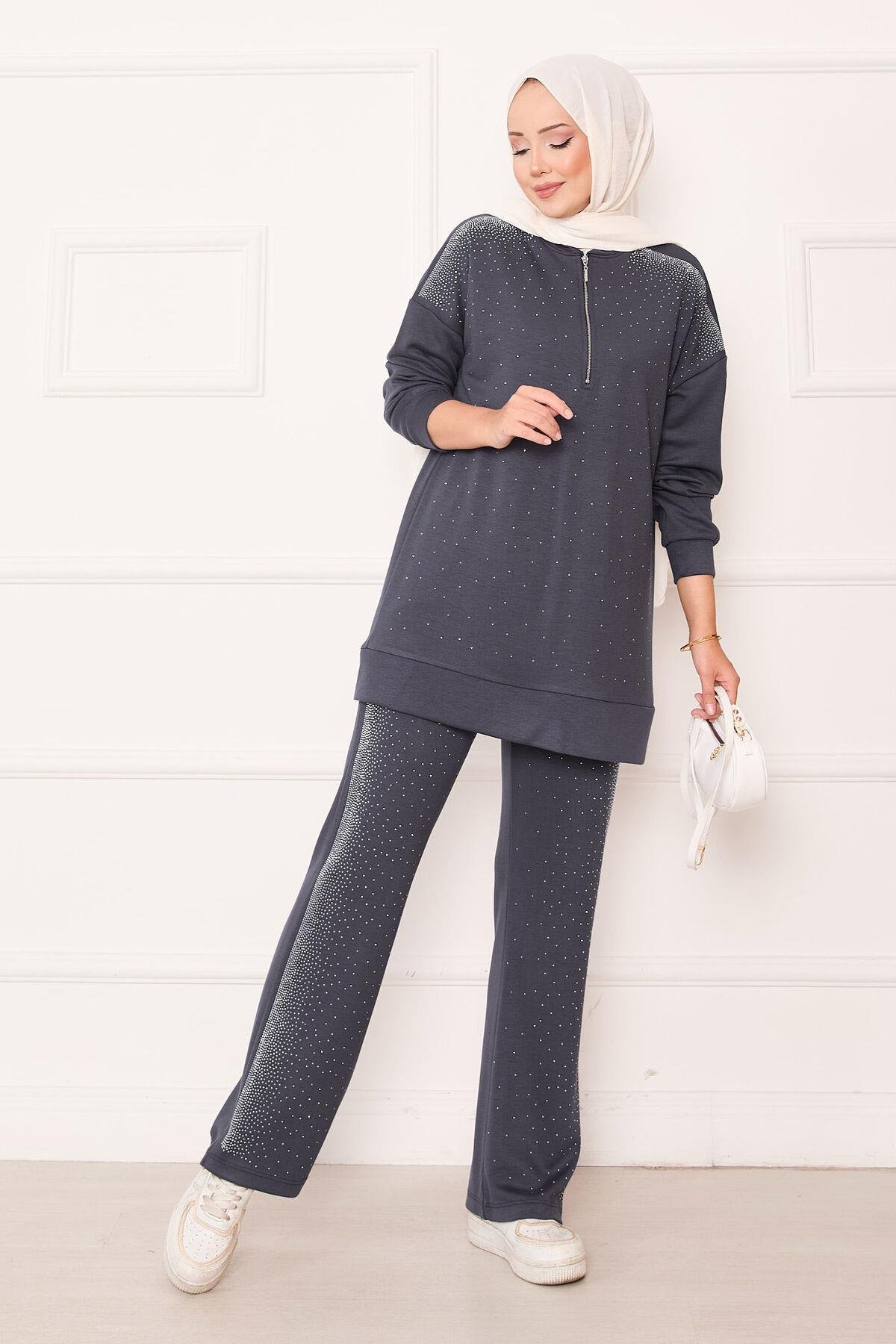 Half Zippered 2 Piece Set with Sprinkled Stones Anthracite (125M00623765R021)