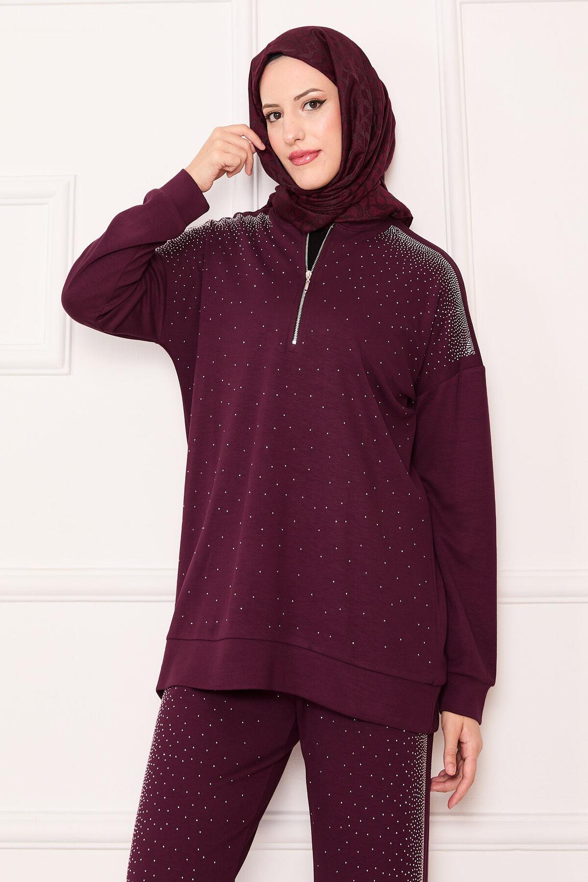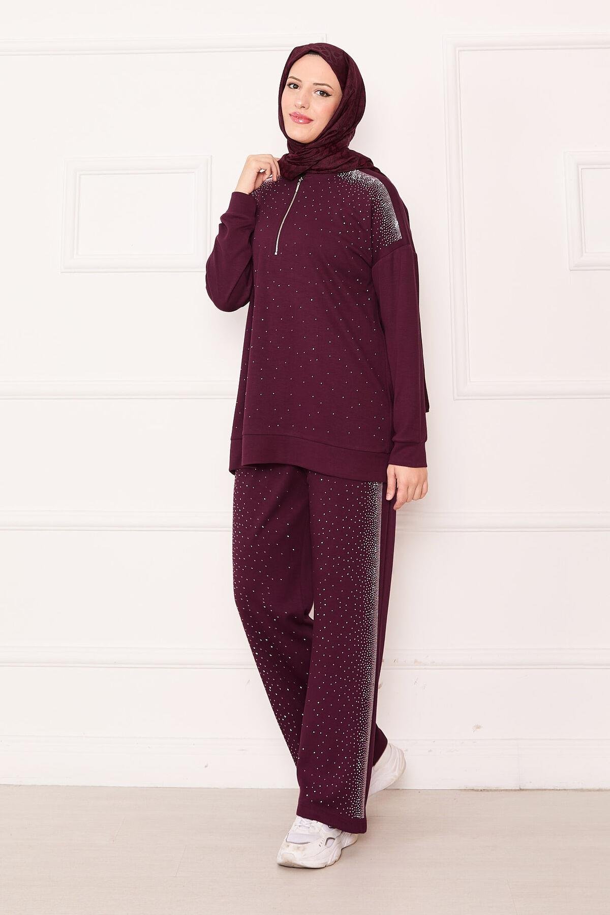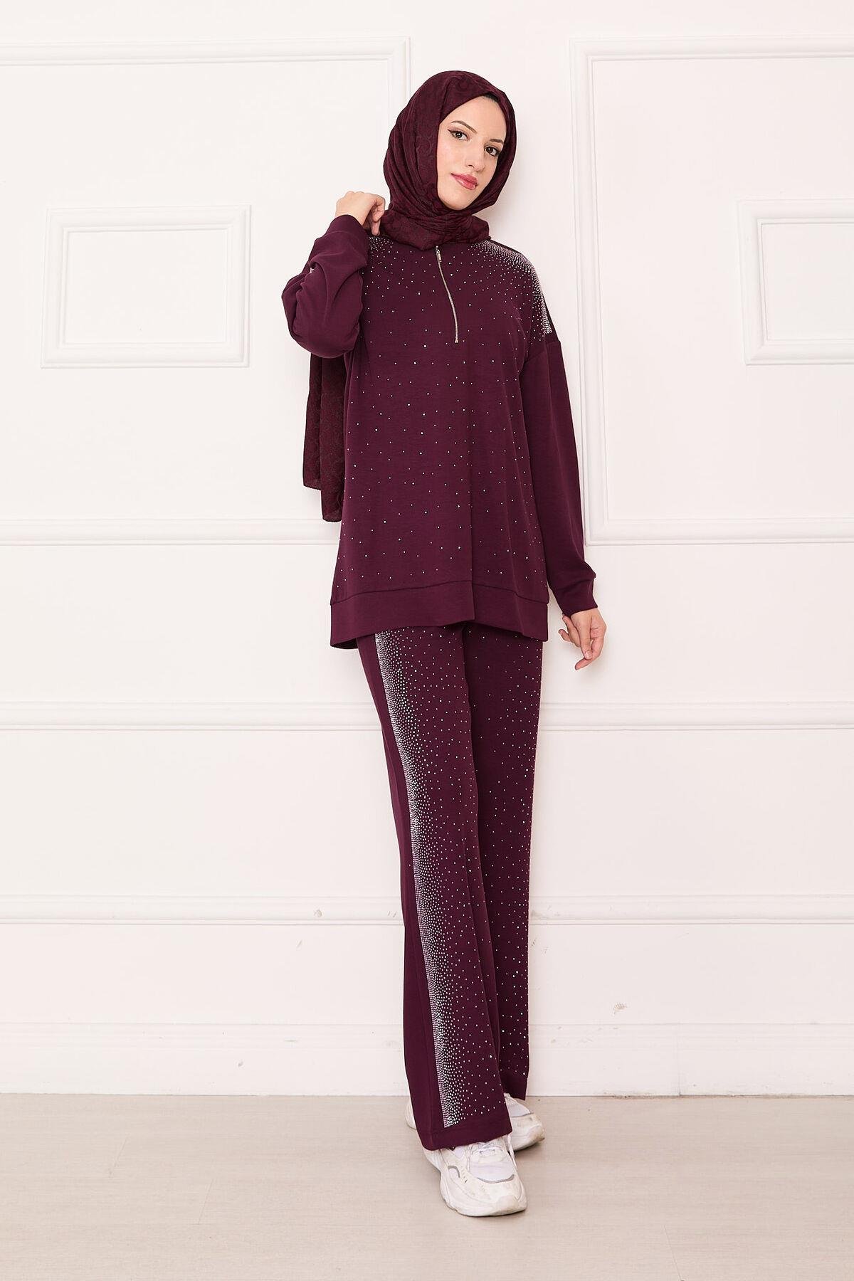 Half Zippered 2 Piece Set with Sprinkled Stones, Burgundy (125M00623765R081)