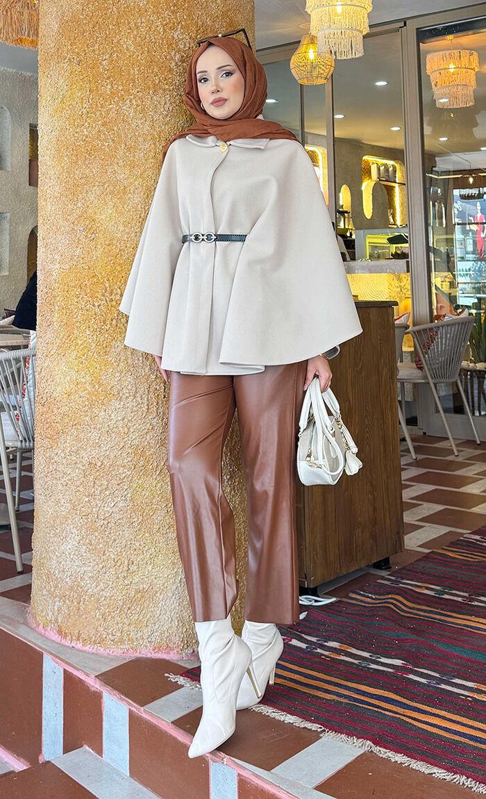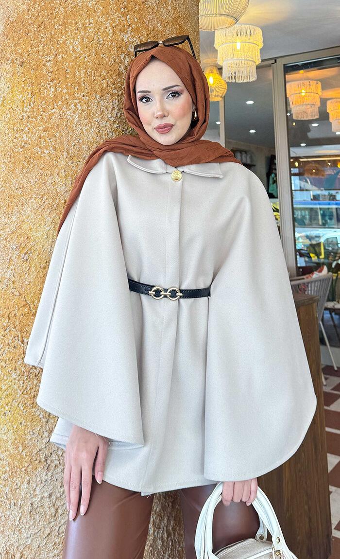 Removable Belted Button Detailed Hijab Poncho Beige (125M02321190R0638)