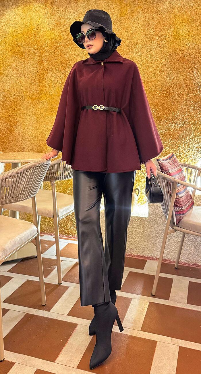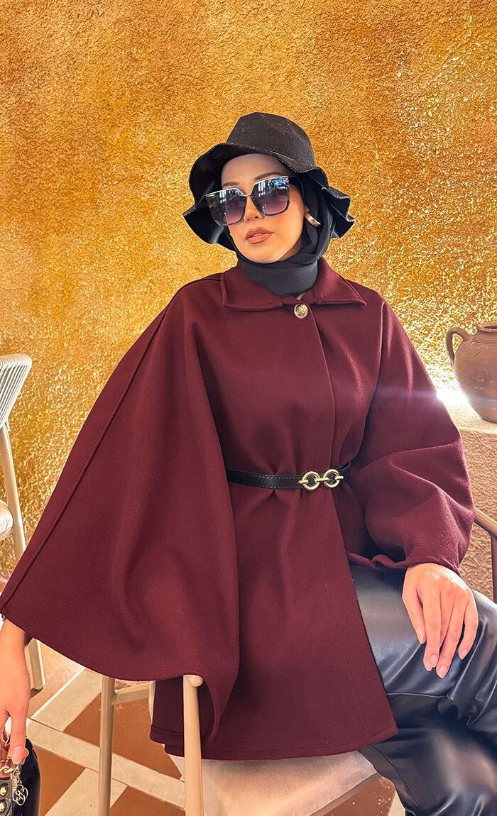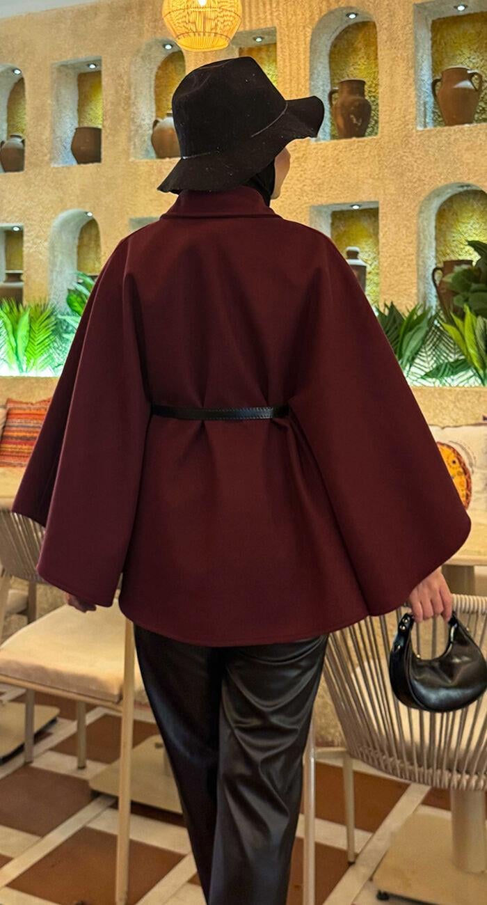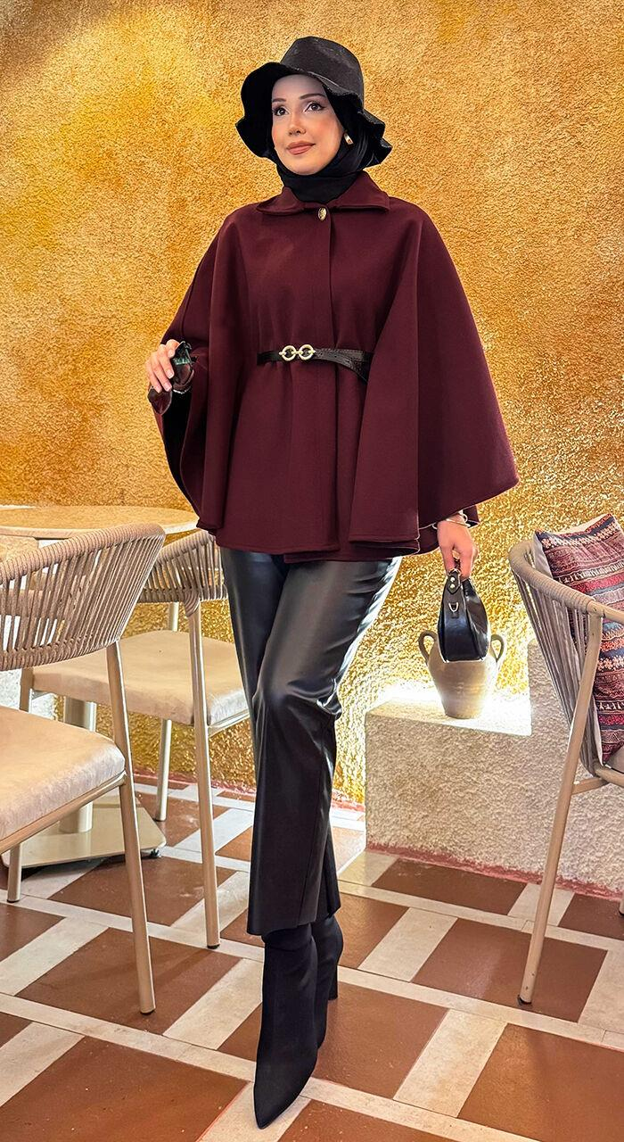 Removable Belt Button Detailed Hijab Cashmere Poncho Burgundy (125M02321190R0838)