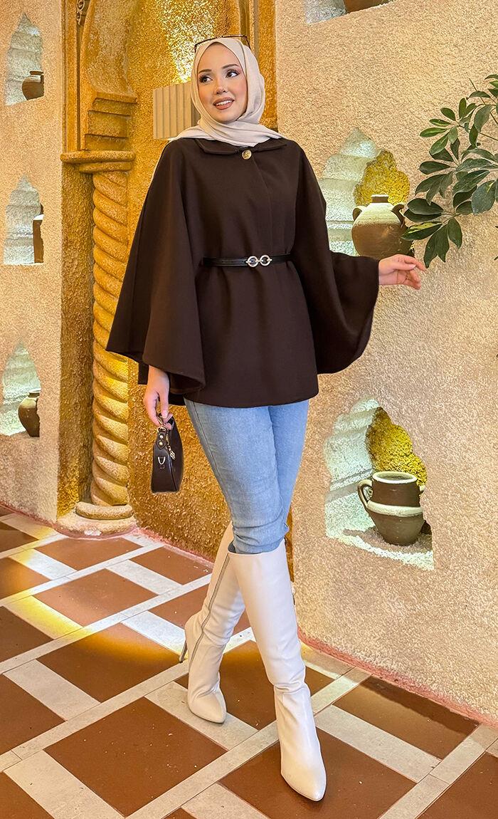 Removable Belt Button Detailed Hijab Cashmere Poncho Brown (125M02321190R2538)