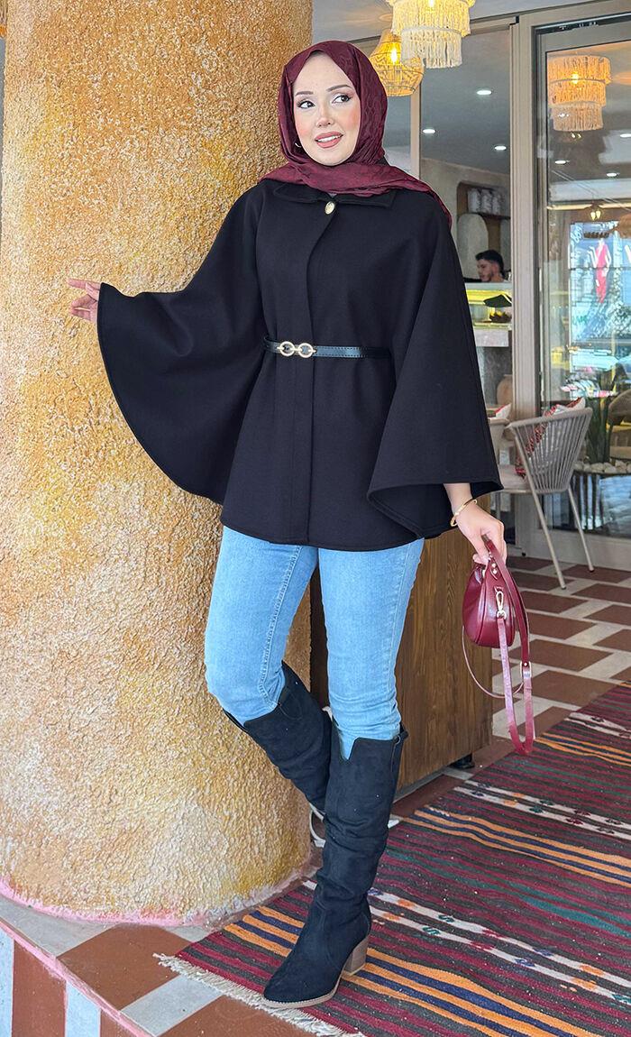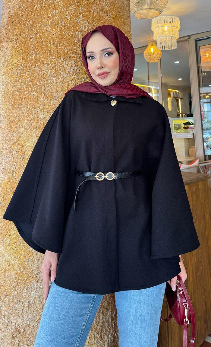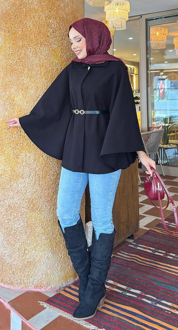 Removable Belted Button Detailed Hijab Cashmere Poncho Black (125M02321190R5238)