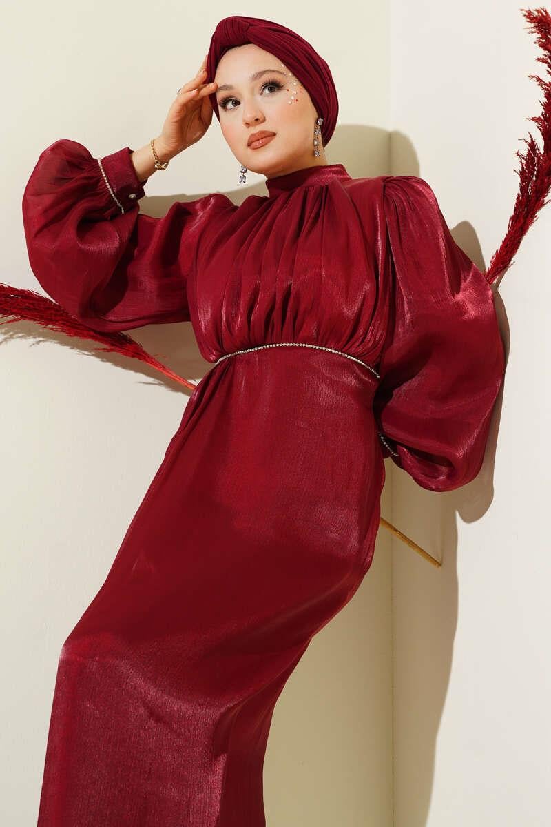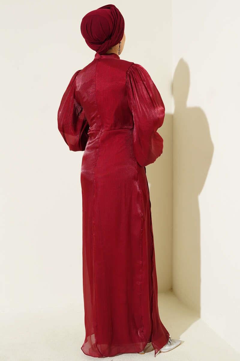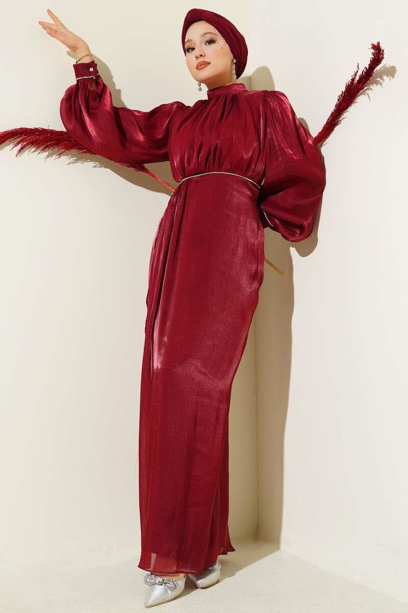 Stone-studded Balloon Sleeve Evening Dress Burgundy (8163-4441-683321)