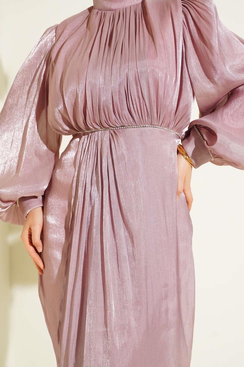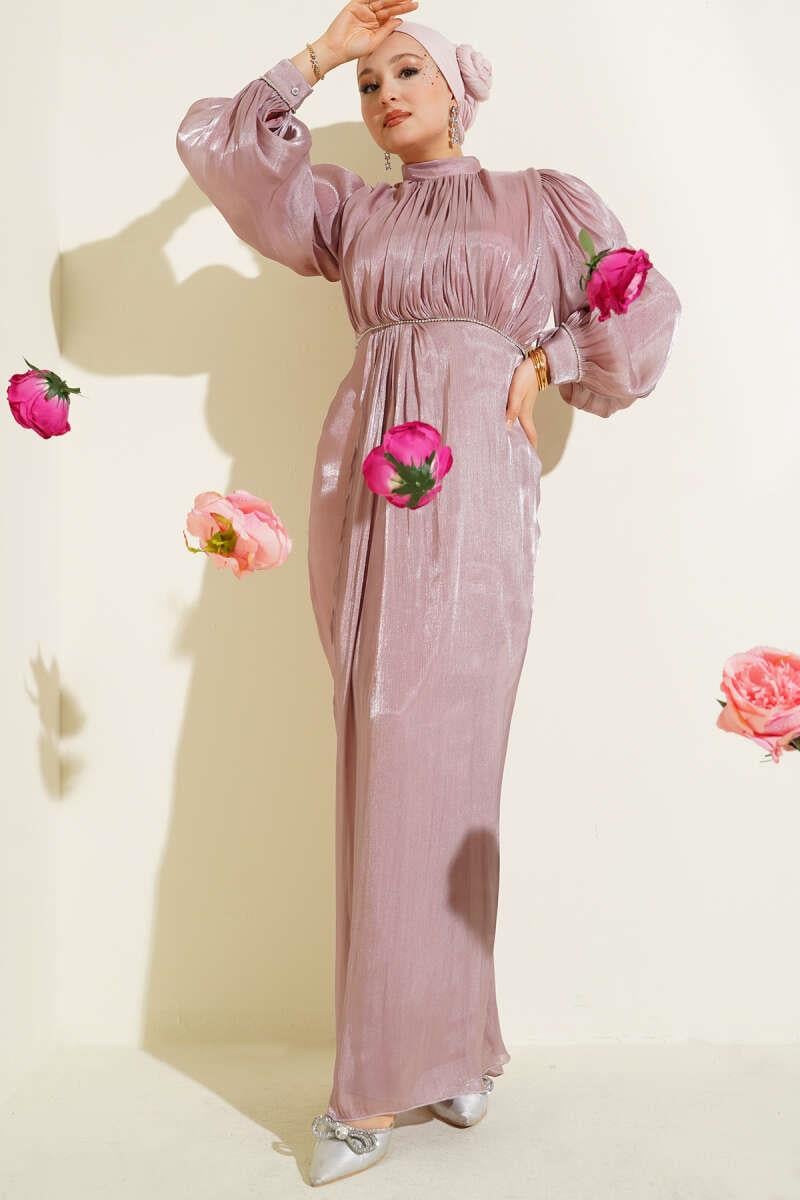 Stone-studded Balloon Sleeve Evening Dress in Dusty Rose (8163-4441-683329)