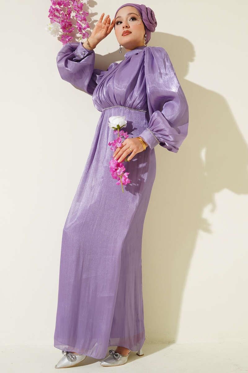 Lilac Balloon Sleeve Evening Dress with Stones (8163-4441-683341)