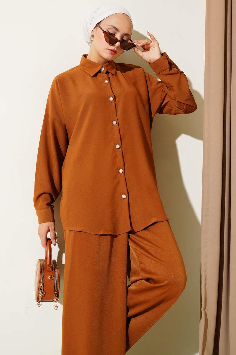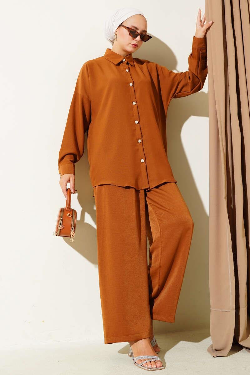 Stone Button Detailed 2 Piece Set Tan (0853-7970-659803)