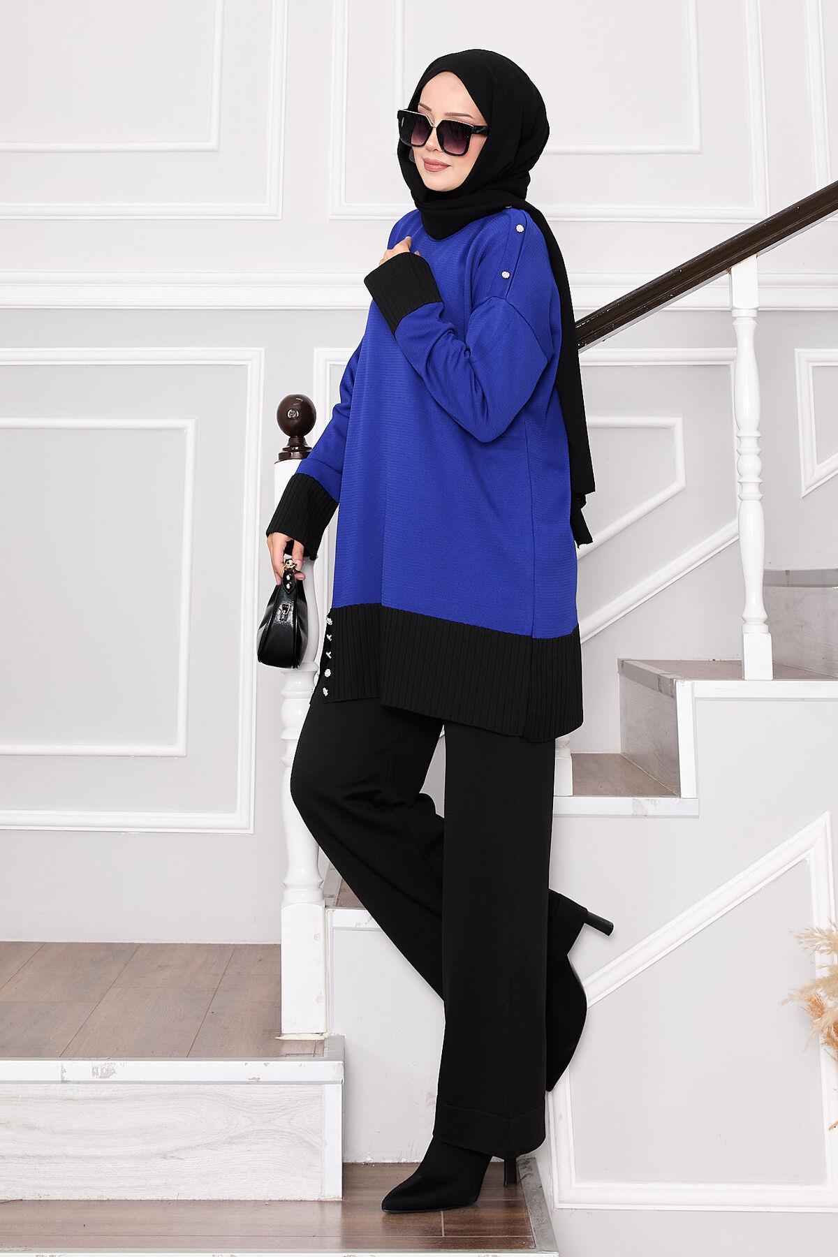 • The product is seasonal. New season two-color Knitwear 2 Piece Set tunic with stone buttons on the front and shoulders, and elastic waist trousers.