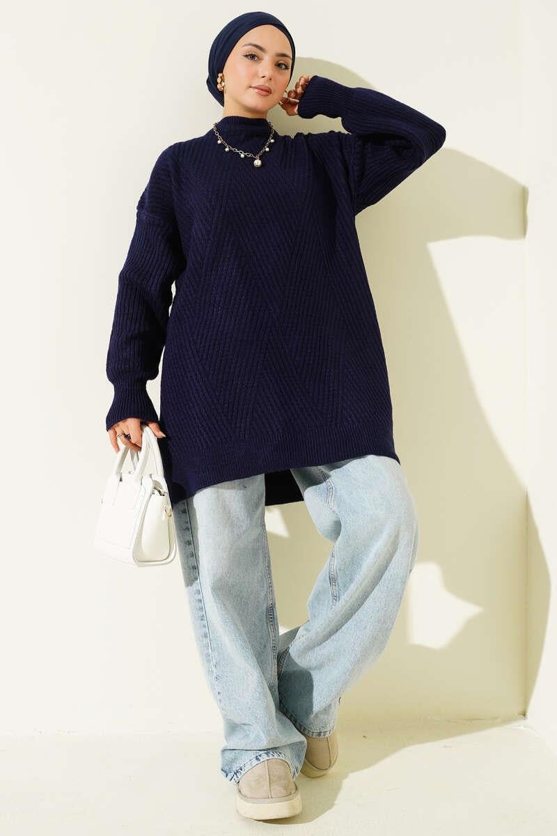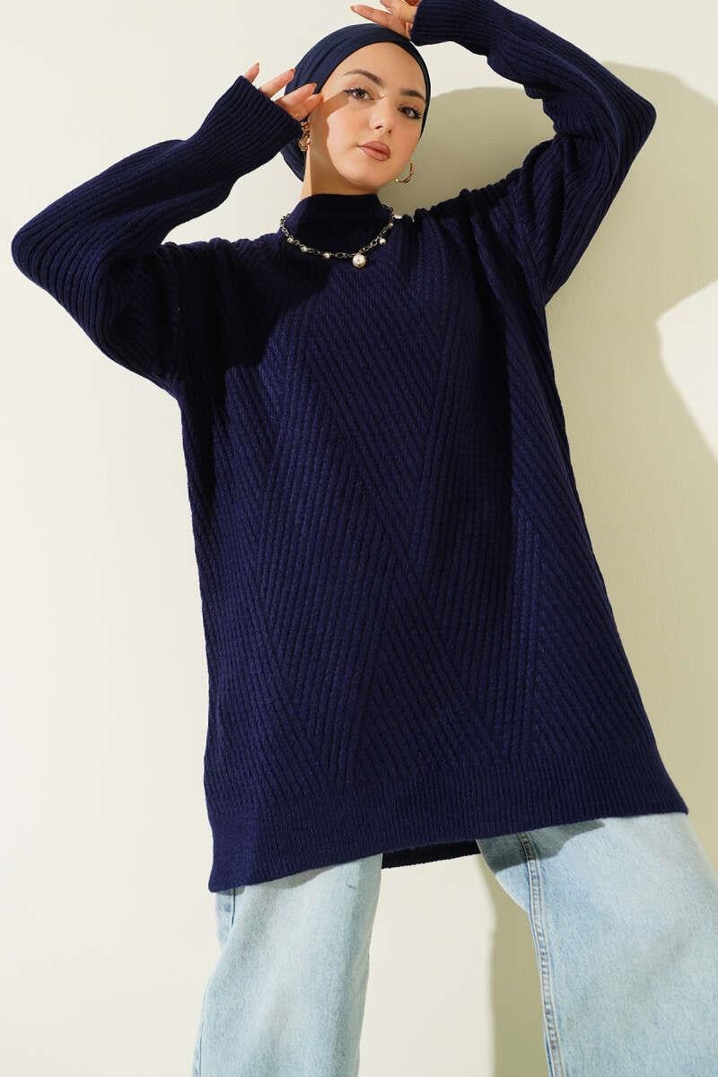 Asimetrik Kabartma Çizgili Triko Tunik Lacivert (8374-0023-687958)