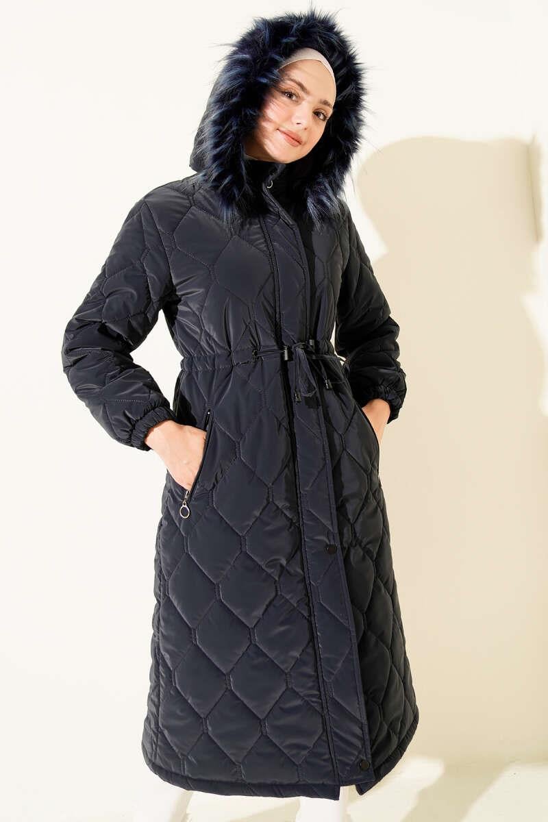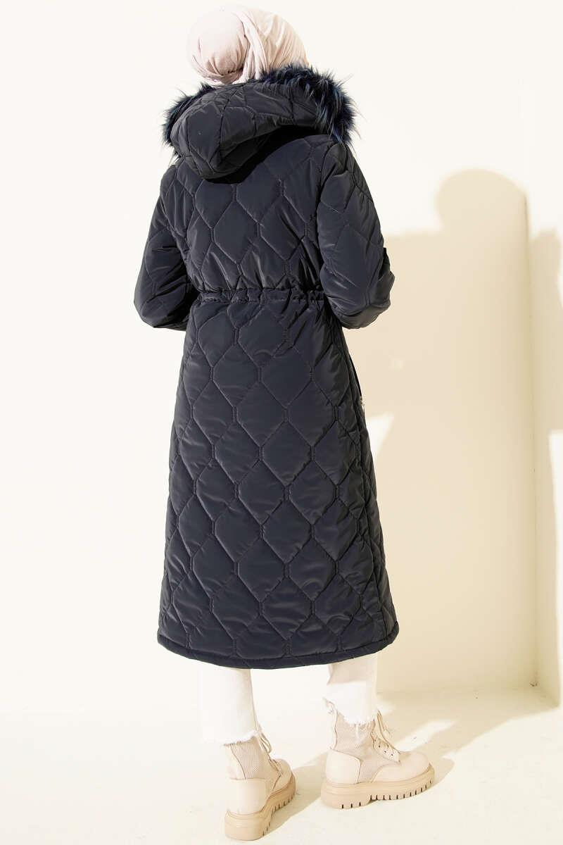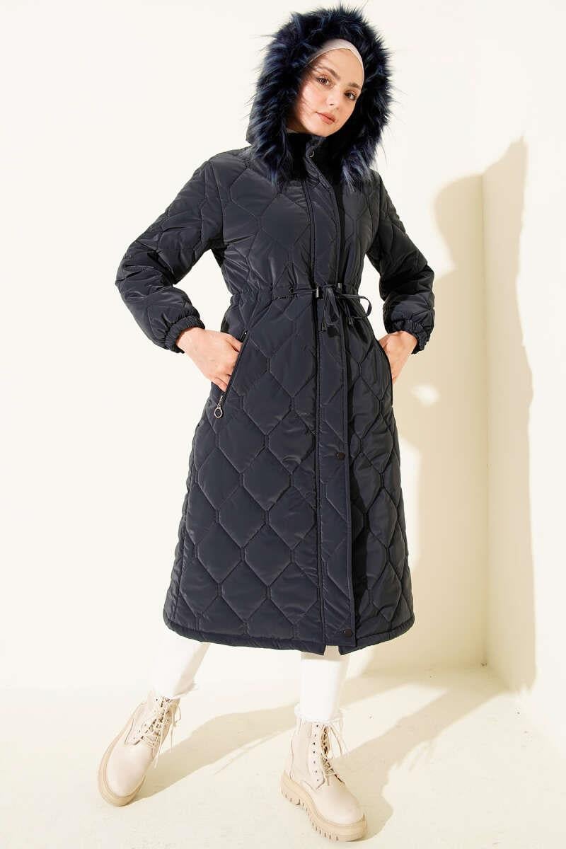 Bel Tünelli Kapüşonlu Kapitone Şişme Mont Lacivert (0569-3237-LACİVERT-40)