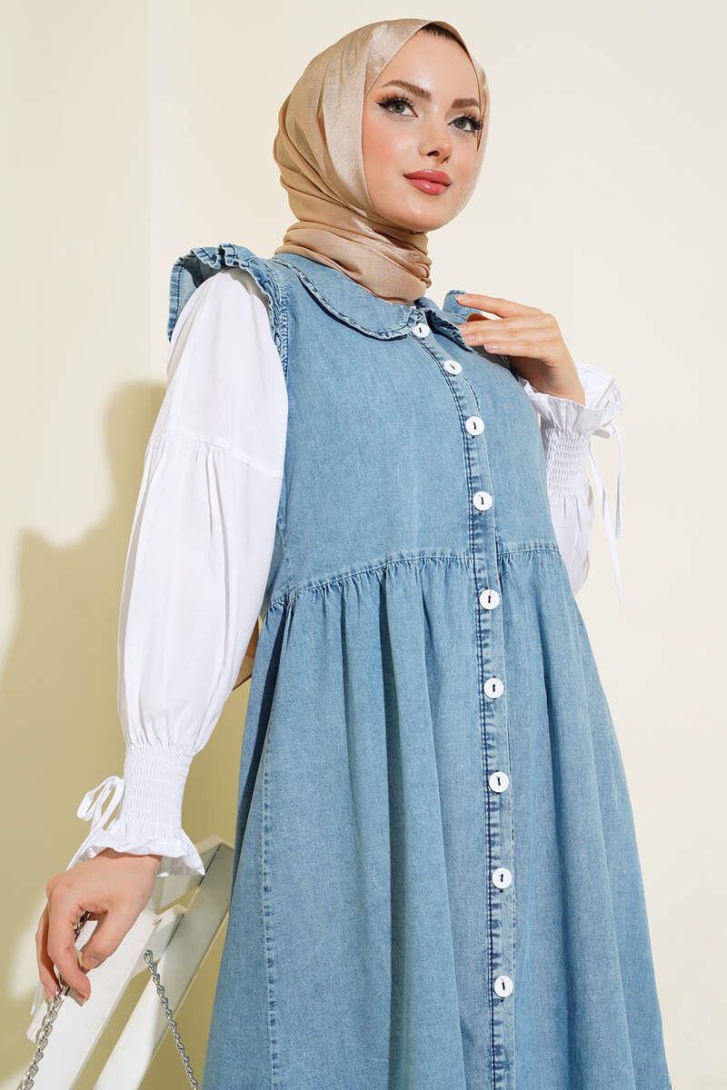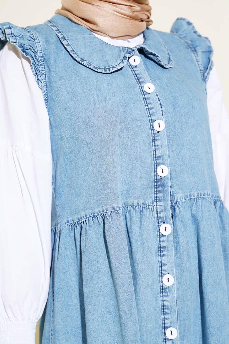 Beyaz Düğmeli Kot Yelek Elbise Kot Mavi (0854-1444-520925)