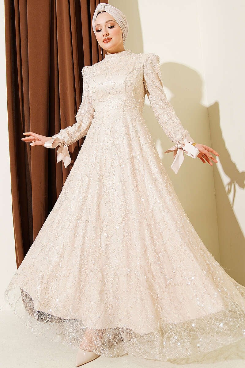 Bilek Bağcıklı Pullu Taşlı Abiye Elbise Bej (8506-1141-752878)
